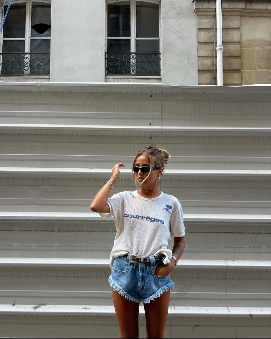 The ensemble masterfully balances casual and chic, with the distressed denim shorts offering a relaxed summer vibe while the graphic tee adds a touch of effortless style. Accessories like the statement belt and sunglasses provide a polished finish, creating a look that’s stylish yet laid-back.