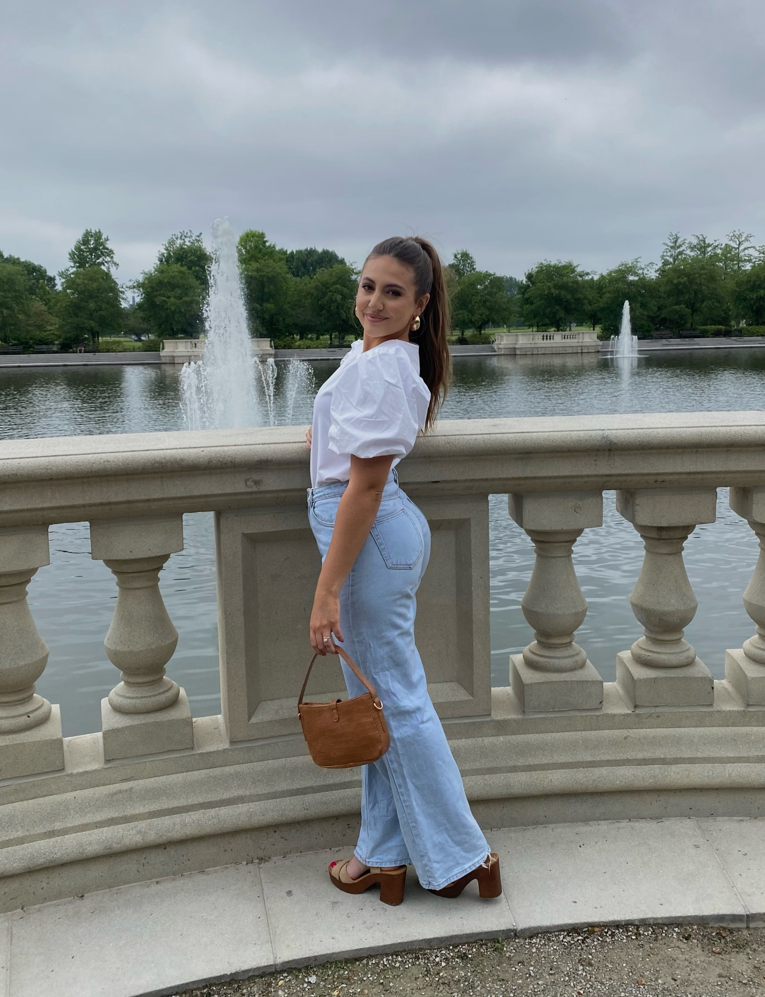 The crisp white blouse with puff sleeves adds a touch of sophistication and pairs elegantly with the high-waisted jeans, creating a classic and flattering silhouette. The outfit is completed with chic accessories—a small brown bag and platform shoes—that complement the ensemble’s vintage vibe.