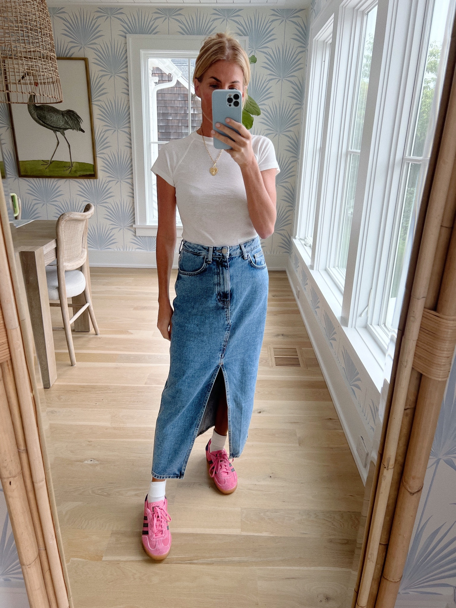 The classic white tee and high-waisted denim combo exude a timeless, casual-chic vibe while the playful pop of pink in the shoes adds a delightful splash of color, elevating the overall ensemble. The simple, yet thoughtful, styling showcases an effortless balance between comfort and trend-awareness.