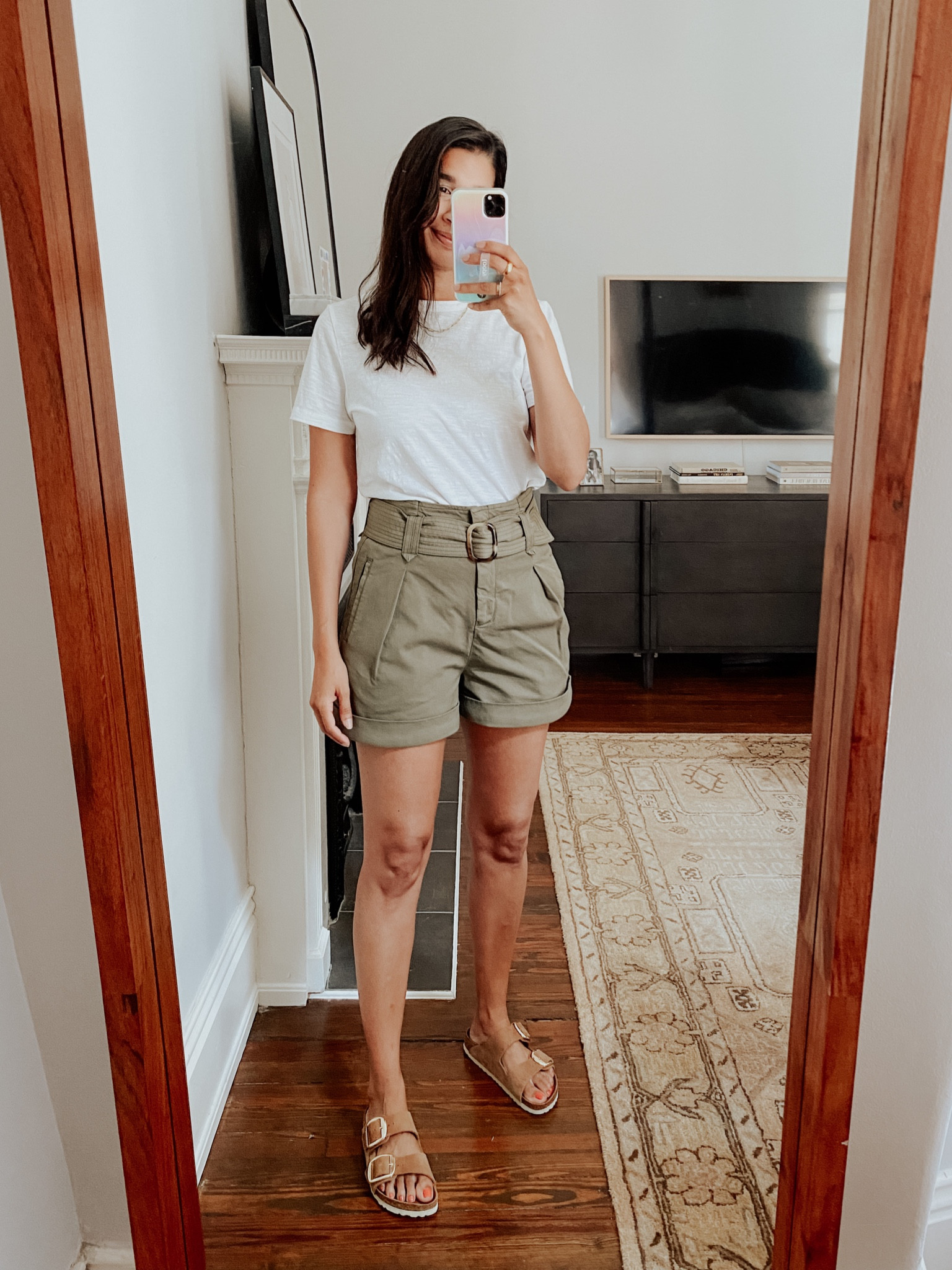 This ensemble elegantly combines simplicity with style; the crisp white tee provides a fresh, clean look, while the high-waisted khaki shorts accentuate the waist and offer a subtle, sophisticated military-chic vibe. The choice of footwear, with its neutral tone, complements the outfit’s earthy palette beautifully, ensuring a harmonious and effortlessly put-together appearance.