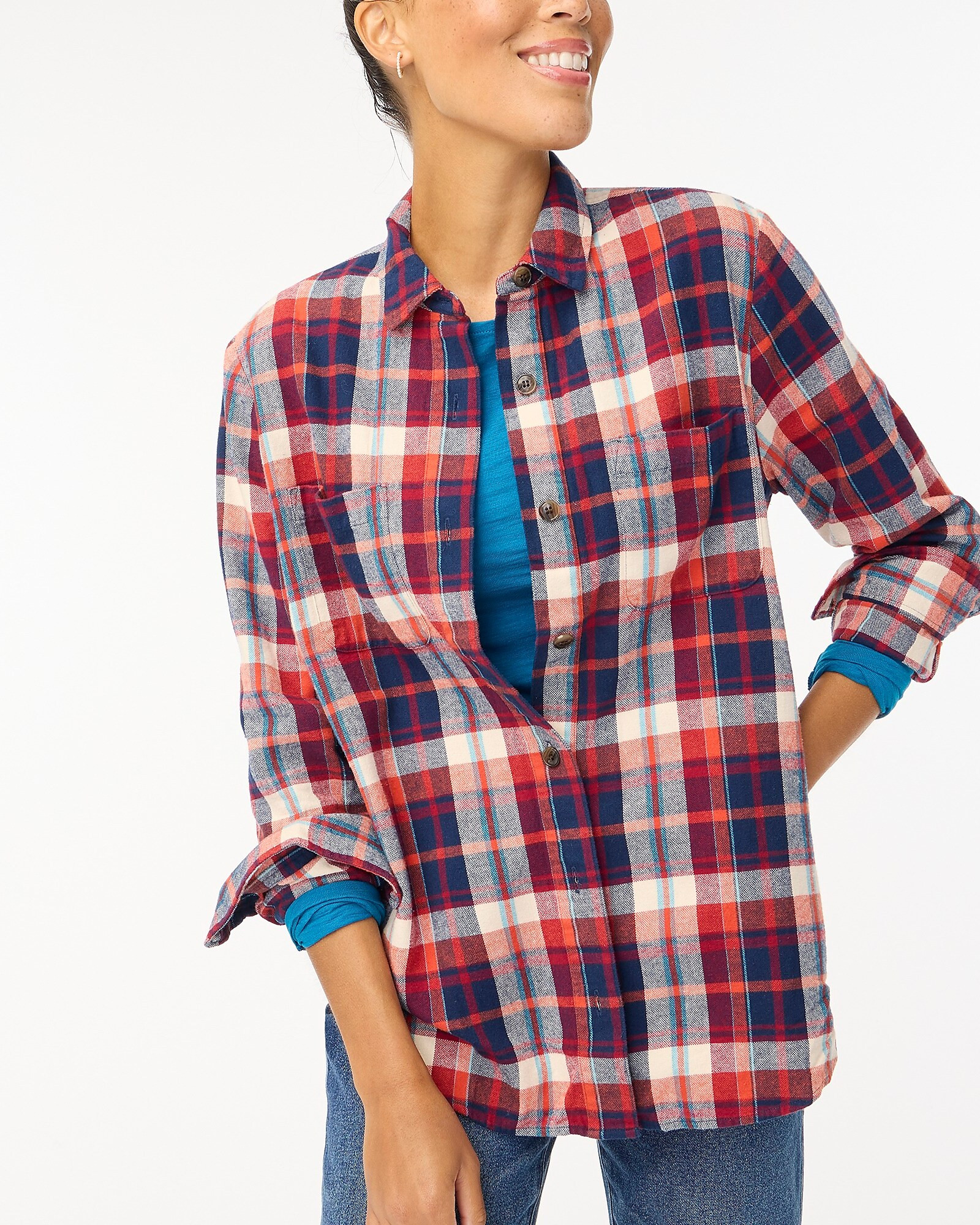 I love how this outfit combines a comfortable, flowing top with stylish, dark-wash flared jeans, creating a look that’s both cozy and chic for the holiday season. The neutral boots add a nice touch, keeping the ensemble balanced and perfect for any casual festive gathering.