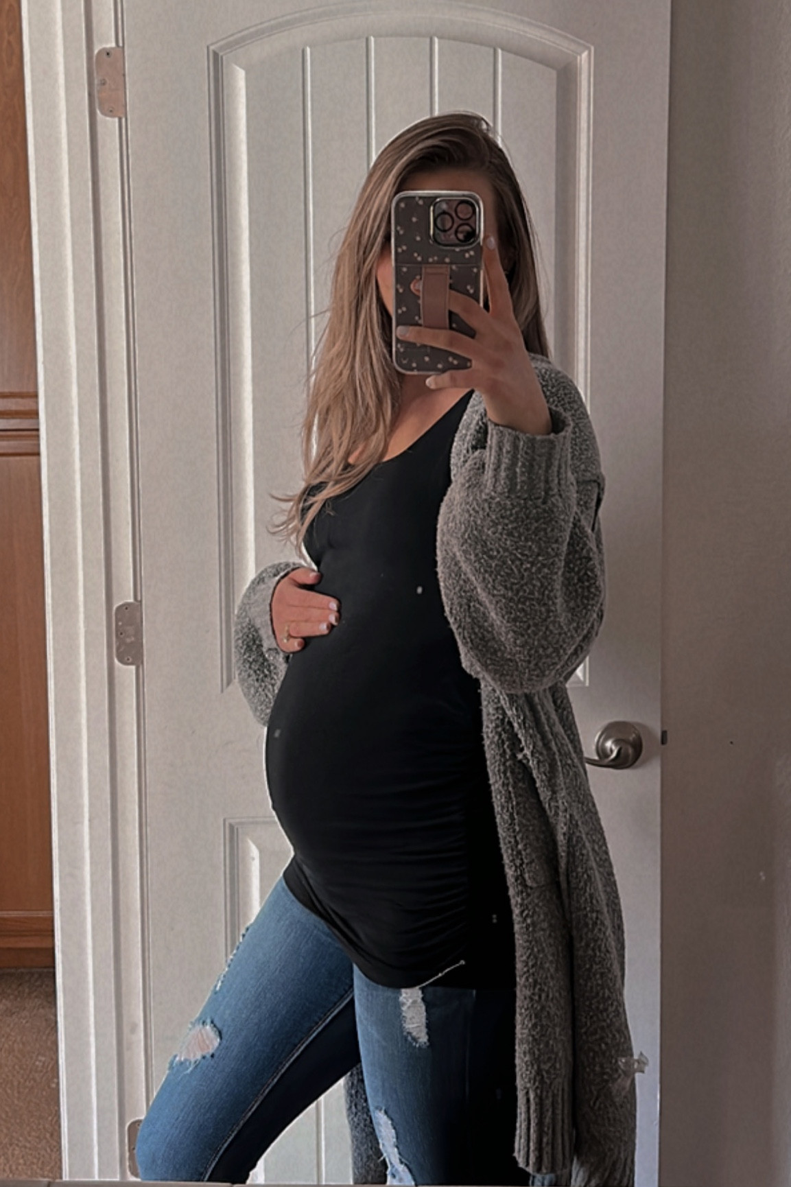 I love this outfit because the cozy, oversized cardigan seamlessly complements the fitted black top and distressed jeans, creating a perfect balance of comfort and style. The look is effortlessly chic and ideal for embracing a laid-back yet trendy aesthetic.