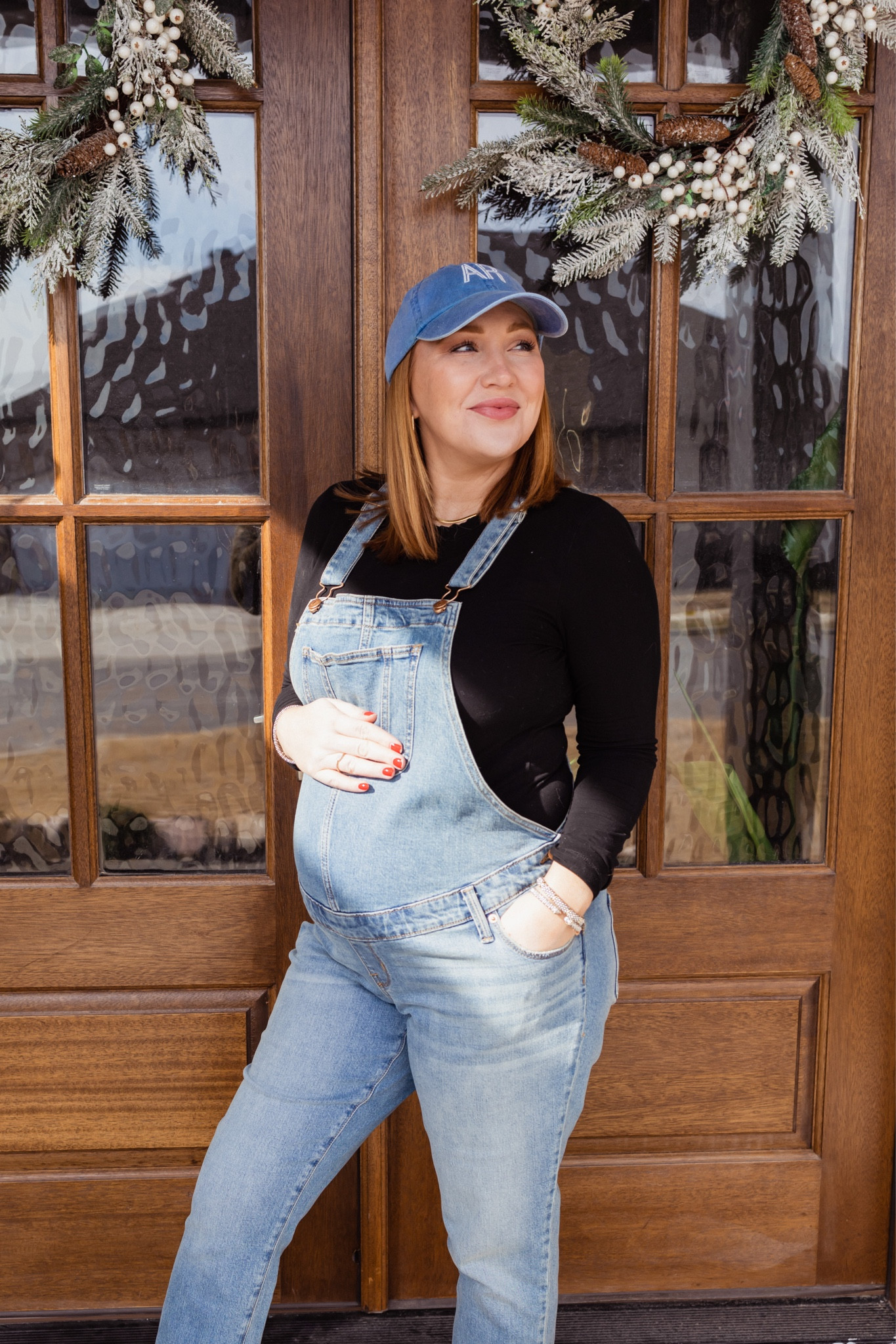 I love how the casual denim overalls bring a timeless, laid-back vibe while the black long-sleeve top adds a sleek contrast. The baseball cap and minimal accessories complete the look with effortless charm and practicality.
