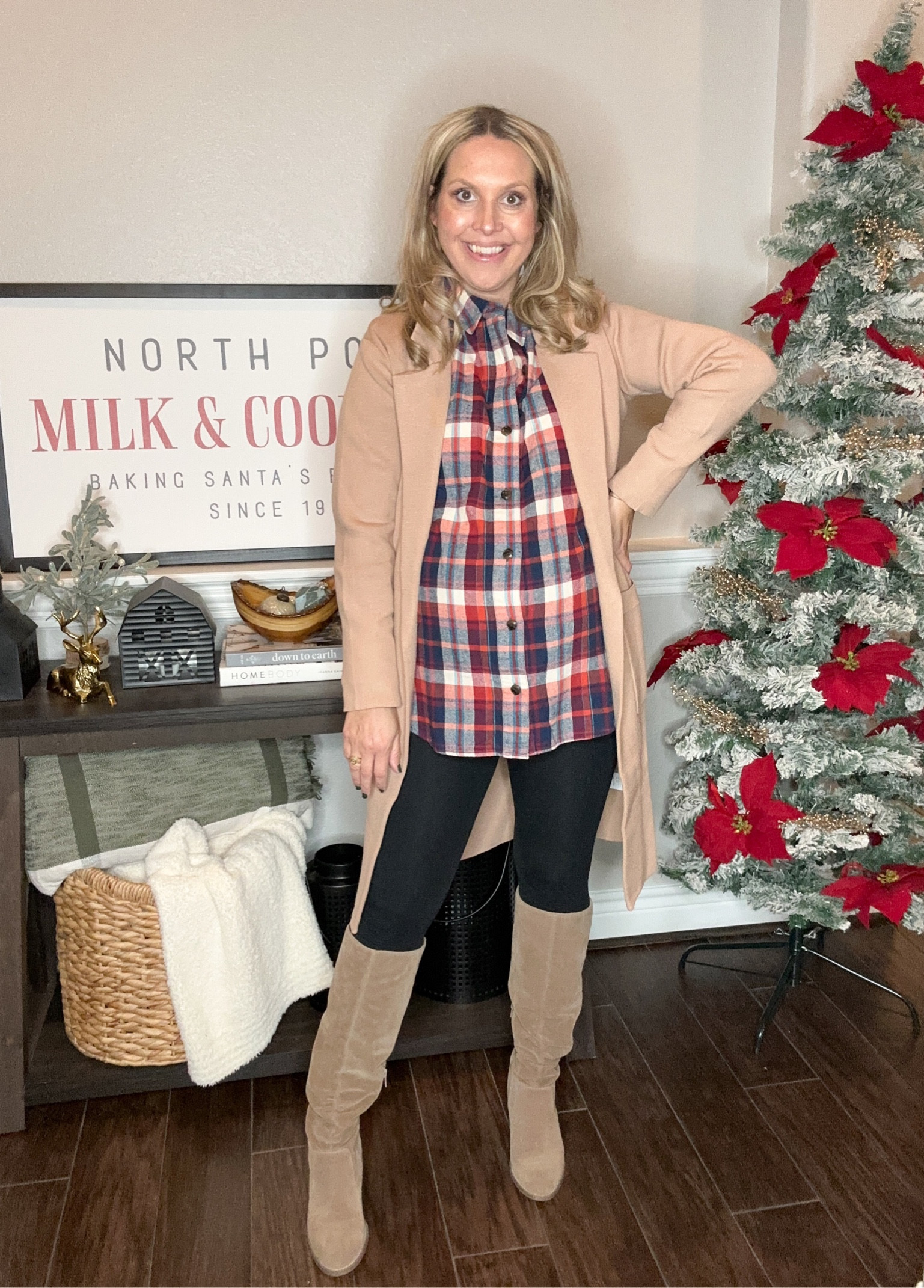 I love how the camel coat adds a sophisticated touch to the cozy plaid shirt, making the outfit perfect for a laid-back holiday gathering. The knee-high boots are a stylish choice that ties the whole look together beautifully.