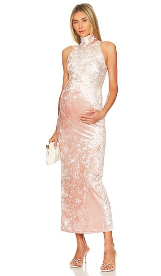 I love how this form-fitting, off-the-shoulder dress accentuates the baby bump while maintaining elegance. The neutral color complements the surroundings beautifully, creating a cohesive and stylish look.