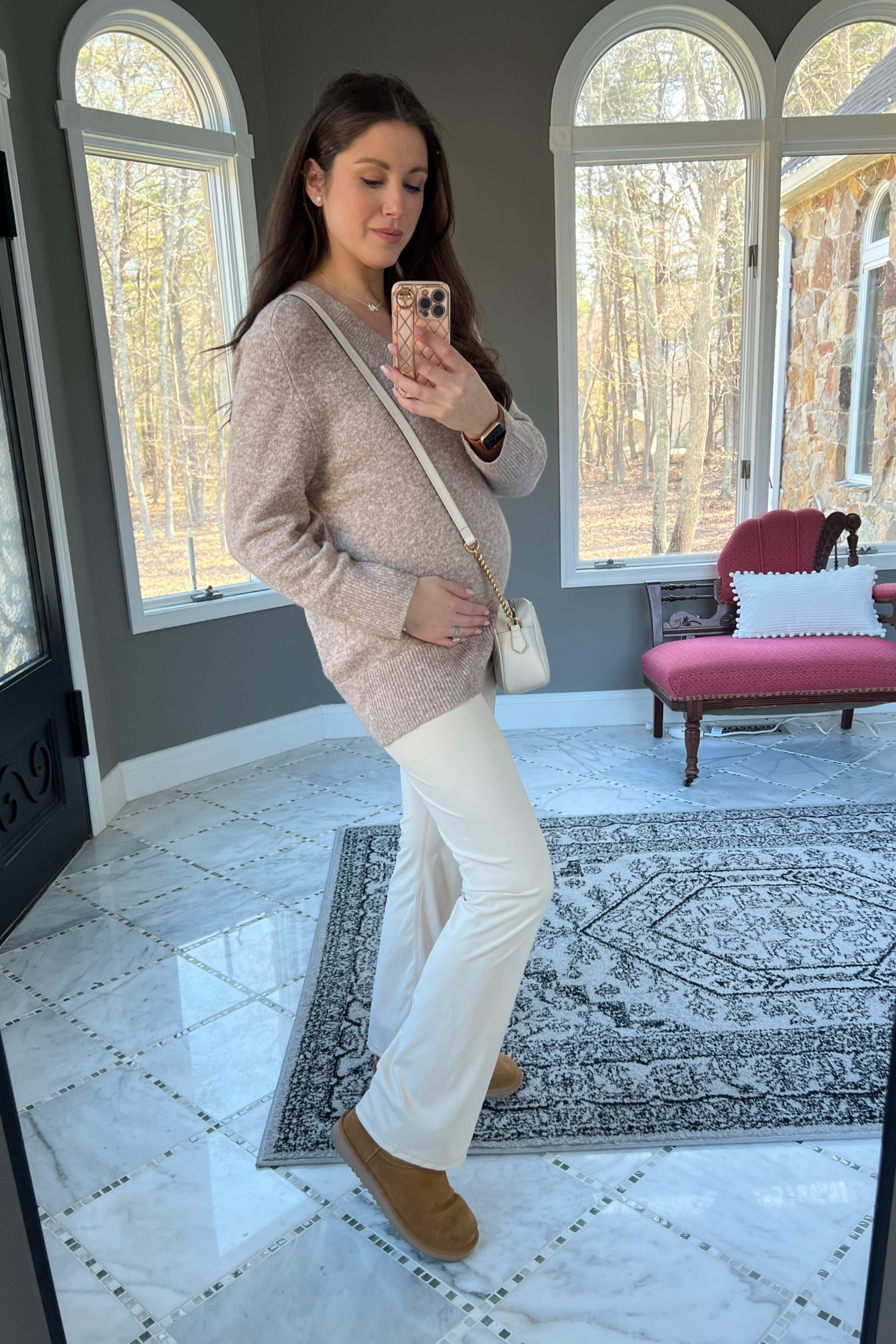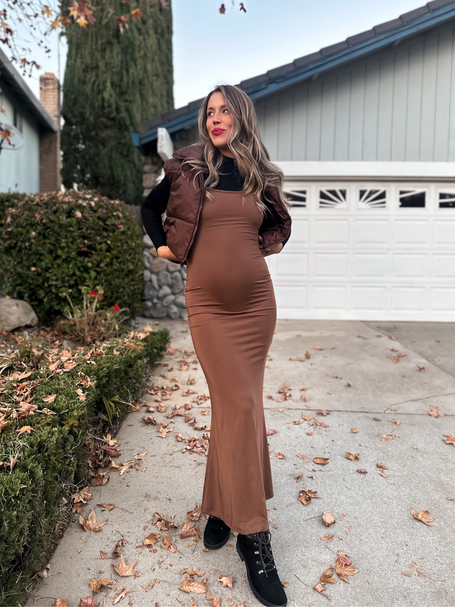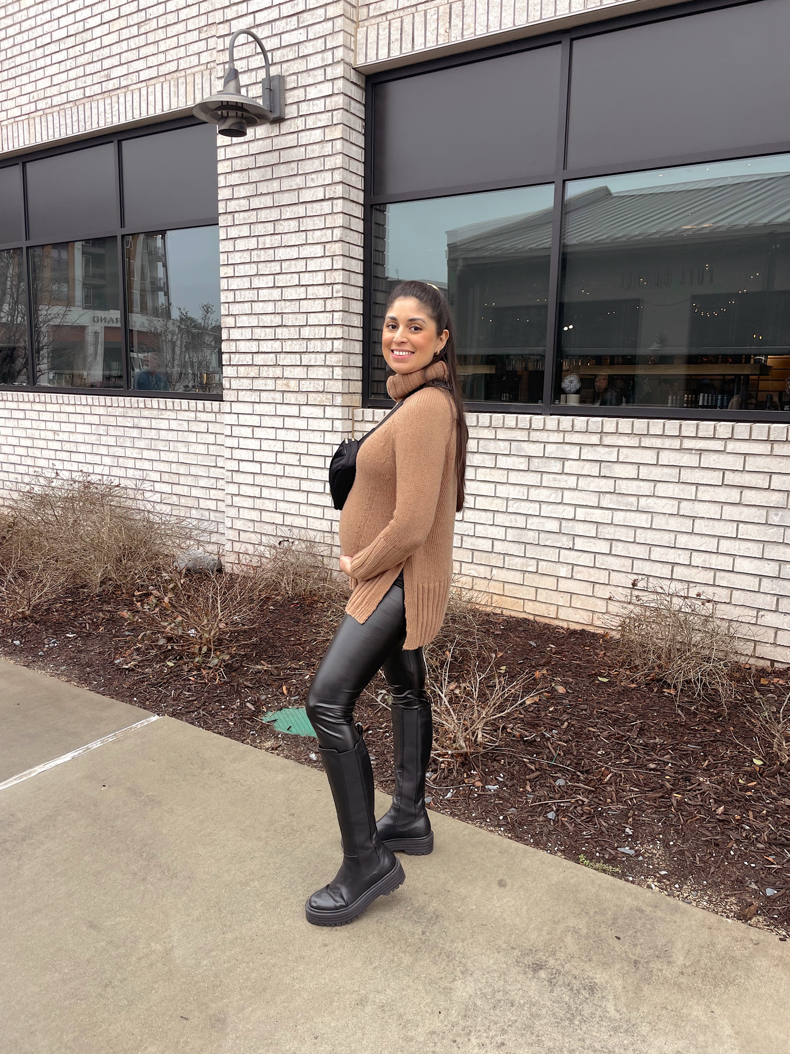 I love how this bump-friendly winter outfit combines comfort and style, with the cozy oversized jacket and stretchy leggings perfectly accommodating a growing belly. The matching brown tones of the jacket and boots create a cohesive look, while the fuzzy socks add a cute, cozy touch.