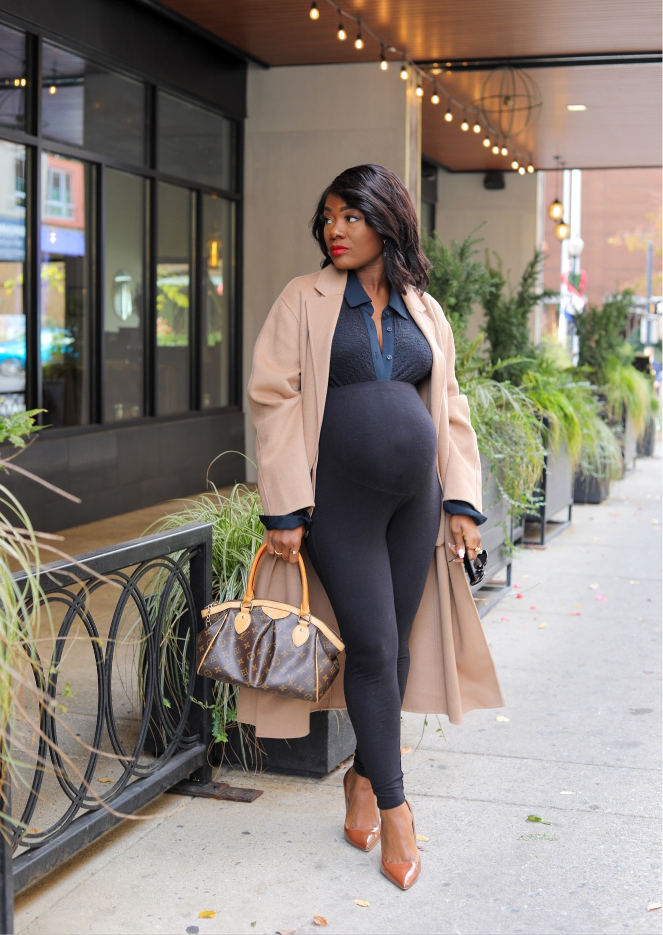 I love how the camel coat adds a sophisticated touch to the sleek black ensemble, creating a chic contrast that’s both timeless and elegant. The pointed-toe heels and designer handbag elevate the look, making it perfect for a stylish day out.