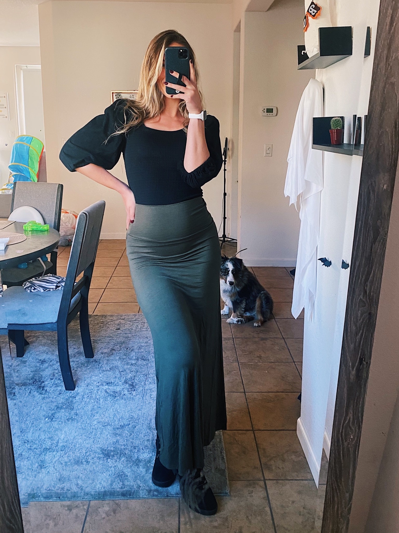 I love how the fitted black top pairs seamlessly with the flowing olive green maxi skirt, creating a balanced silhouette. The outfit’s simplicity is elevated by subtle, elegant touches, making it effortlessly chic and versatile.