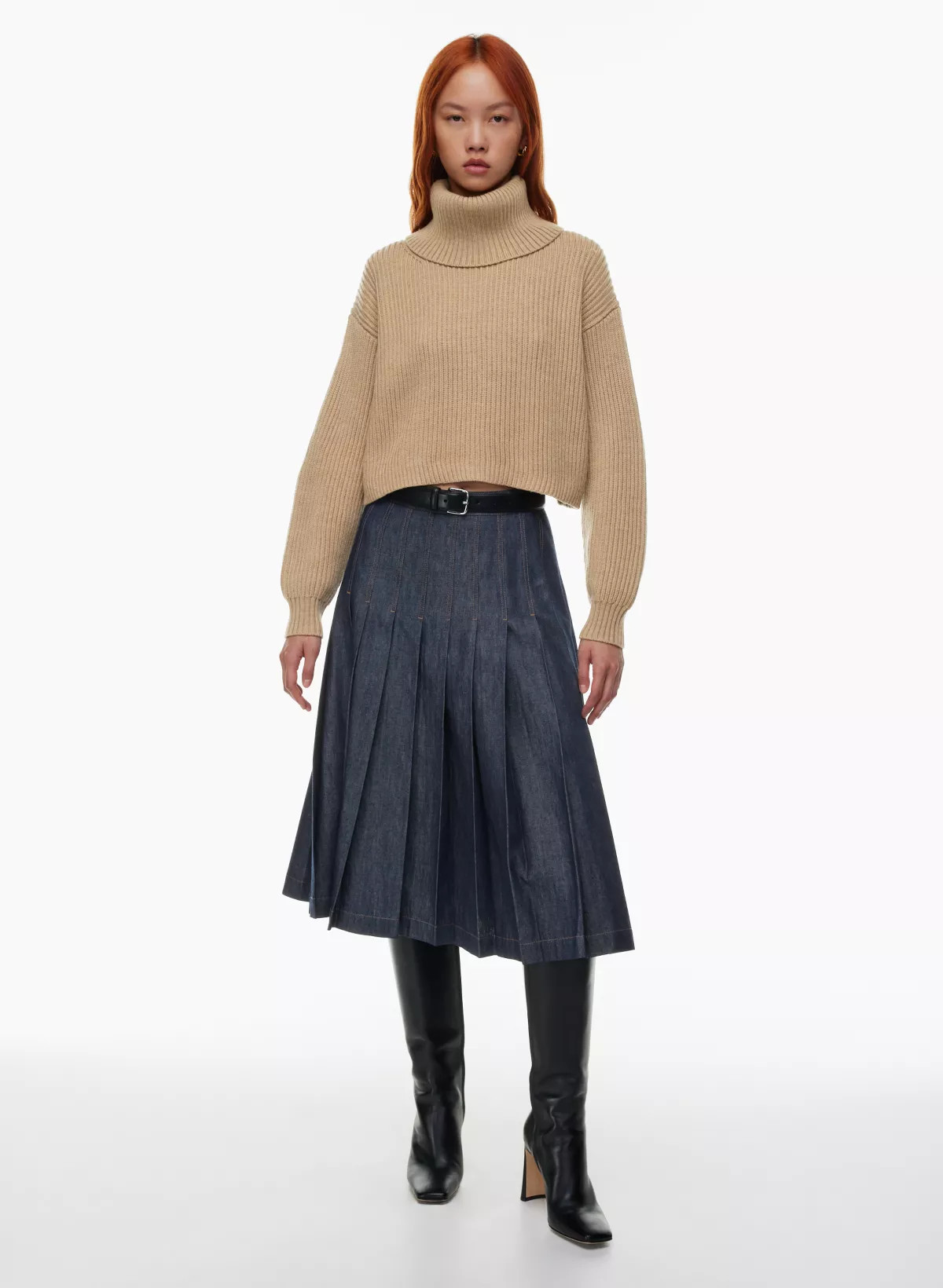 I love the cozy vibe of the ribbed sweater dress paired with the stylish belt, which perfectly highlights the baby bump. The knee-high boots add a chic and trendy touch to the whole ensemble, making it perfect for winter festivities.