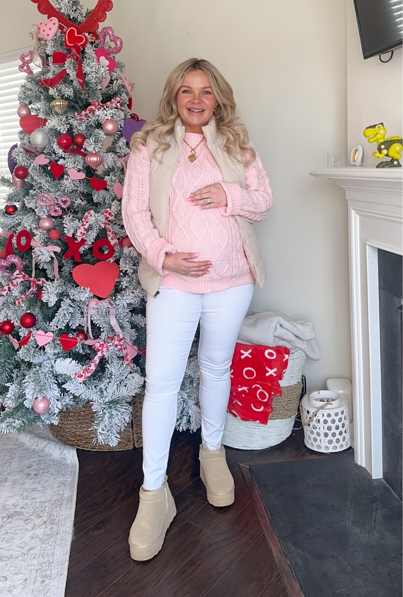 I love this outfit because the soft pink sweater and matching vest create a cozy, stylish look that’s perfect for the season. The white pants and boots elegantly balance the ensemble, making it fresh and chic.