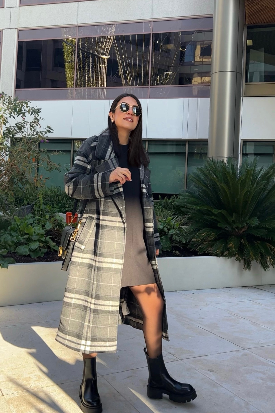 I love this outfit because the oversized plaid coat perfectly balances with the fitted black dress, creating a chic and modern look. The chunky boots add a touch of edge and practicality, making it both stylish and functional for cooler weather.