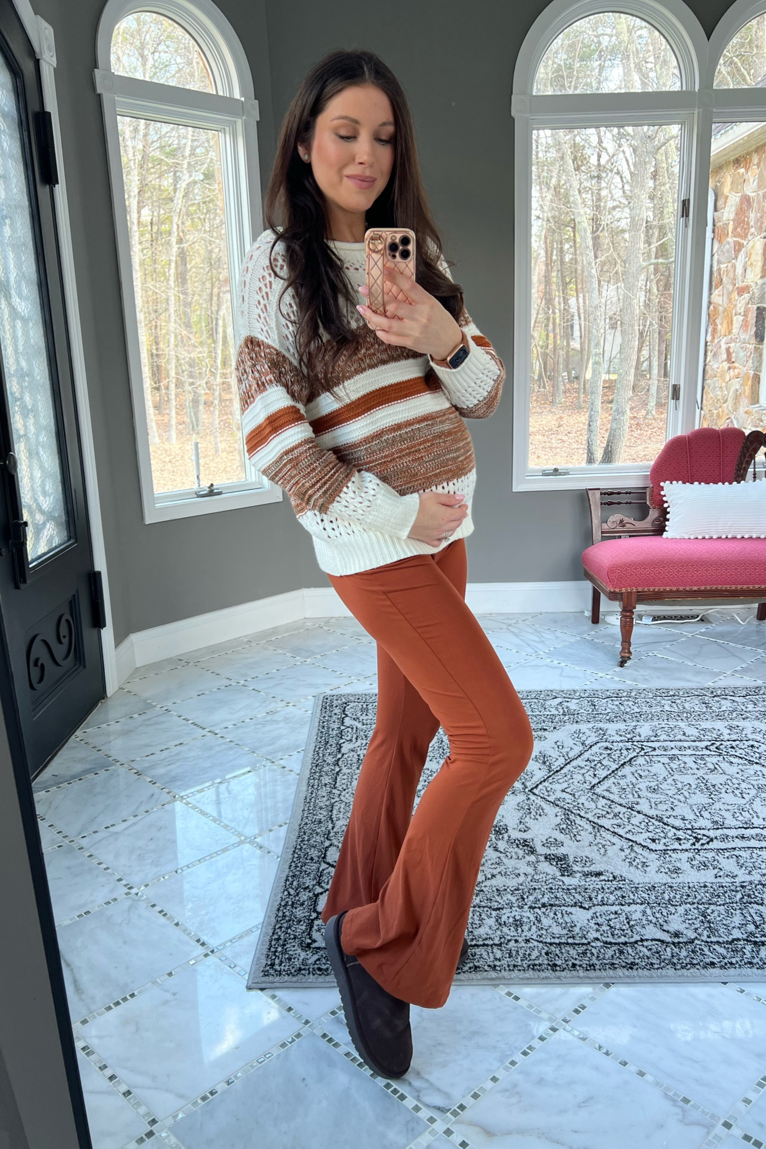 I love how the earthy tones of the sweater and pants create a warm, cohesive look perfect for fall. The cozy knit of the sweater paired with the comfortable, flared pants strikes a perfect balance between style and comfort.
