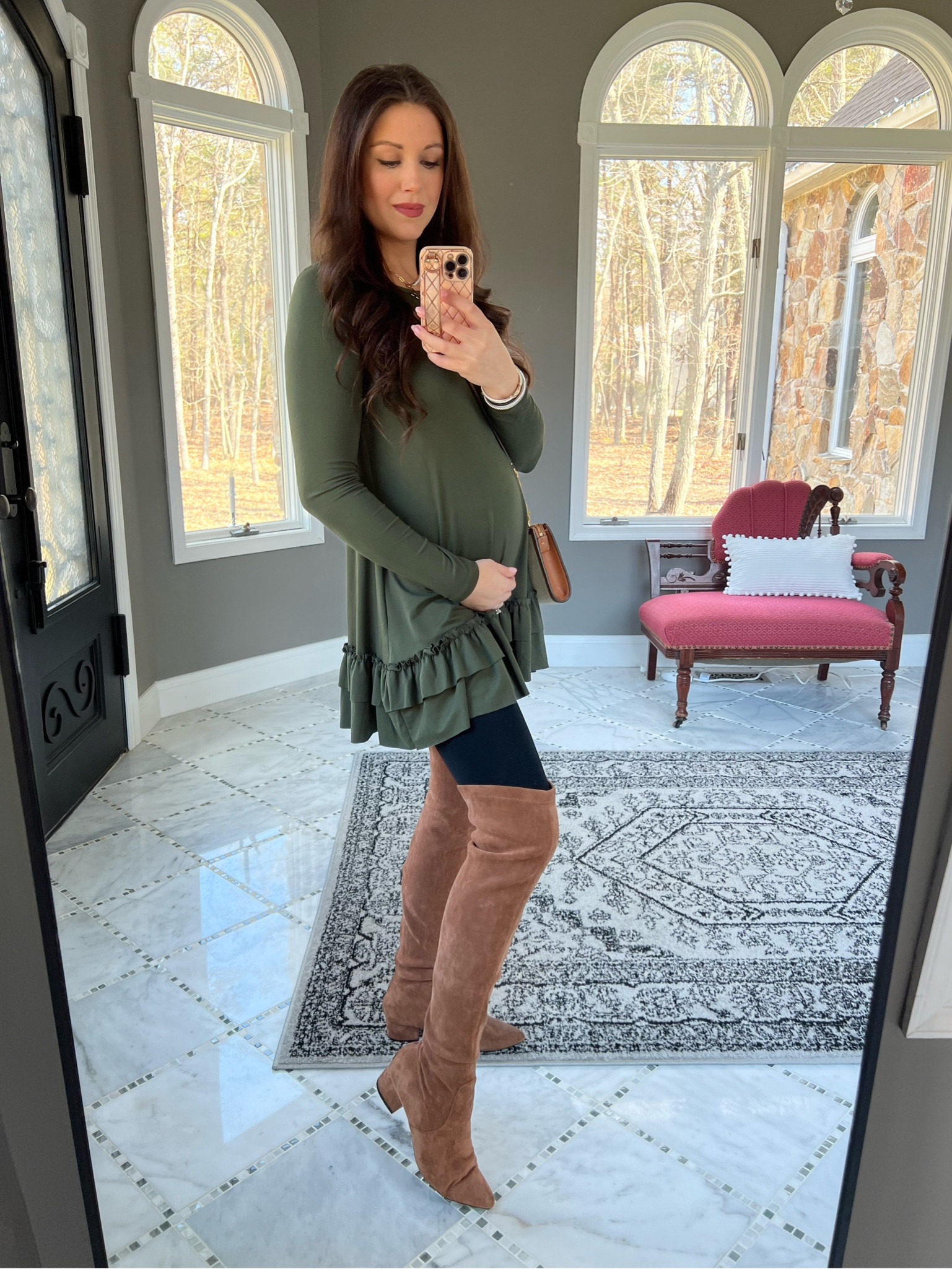 I adore this outfit because the olive tunic with ruffled hem is both comfortable and chic, and the over-the-knee boots add a stylish and trendy touch. The overall look is effortlessly elegant and perfect for transitioning seasons.