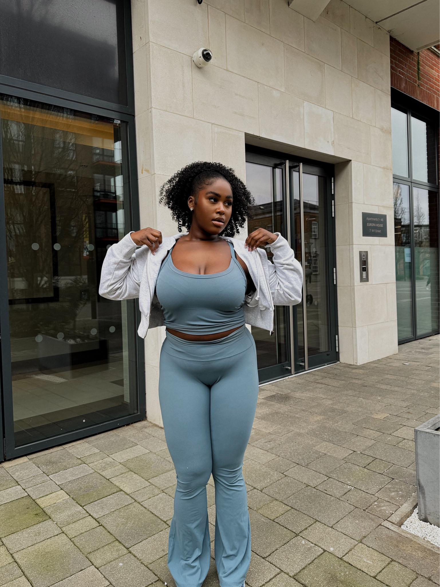 I adore this outfit because the coordinated set in soft pastel tones highlights her figure beautifully while exuding an effortless, sporty chic vibe. The addition of the light jacket adds a versatile layer that’s both practical and stylish.