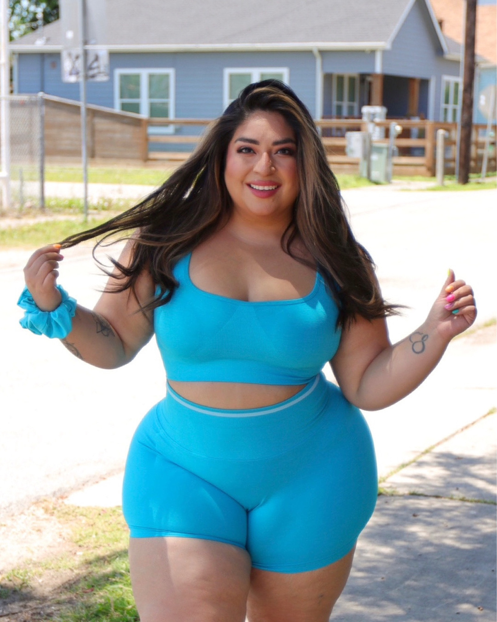 I love how this outfit expertly combines vibrant color with a flattering fit, enhancing and celebrating natural curves. The matching scrunchie is a delightful touch, pulling the look together seamlessly.