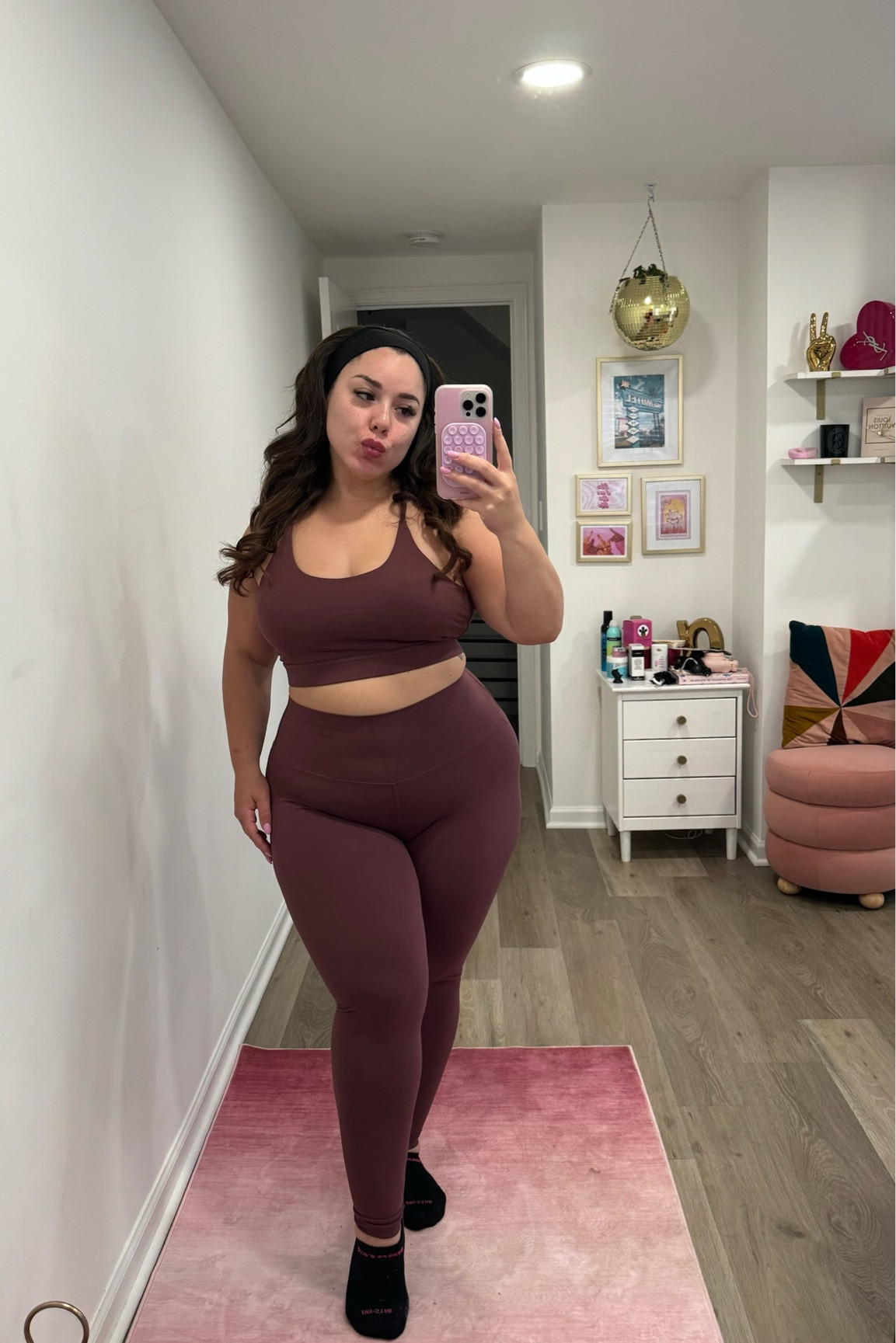 I love how the deep burgundy color of this athleisure set adds a touch of sophistication while the high-waisted leggings provide comfort and a flattering silhouette. The layered top with the peek of a sports bra creates a stylish, functional gym-to-street look.