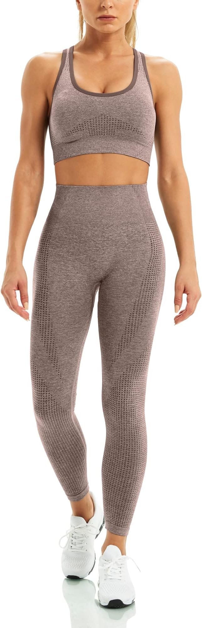 I love the seamless coordination of the matching set, which flatters the figure beautifully. The rich, earthy tone exudes a cozy yet chic vibe, perfect for both lounging and light workouts.