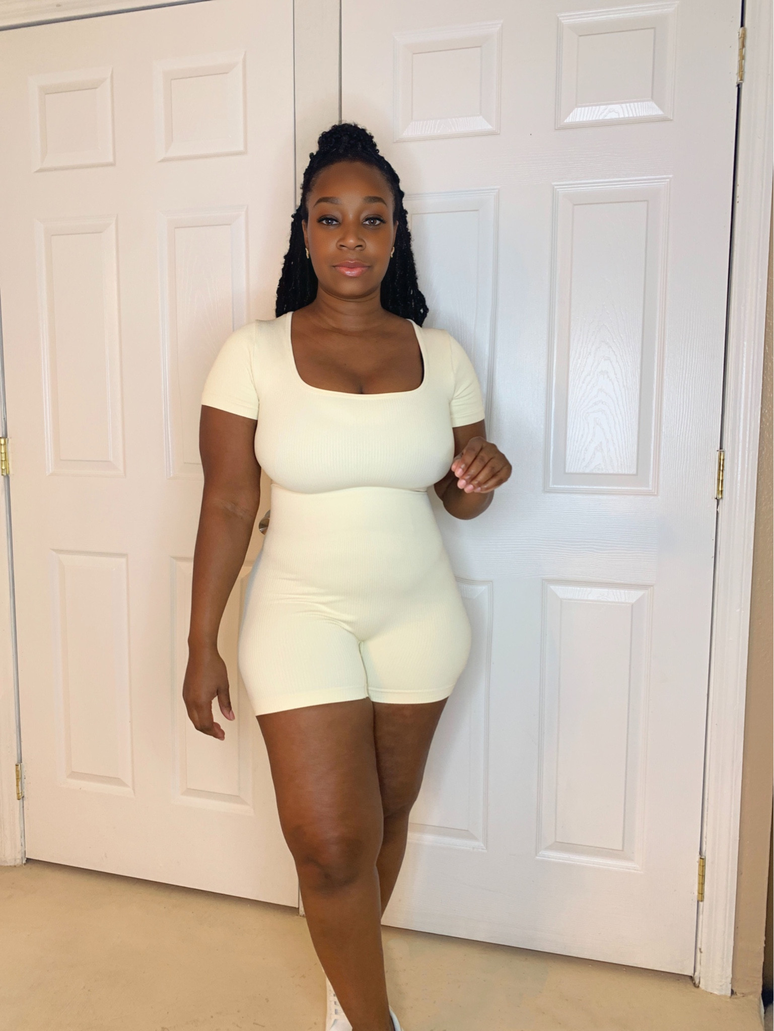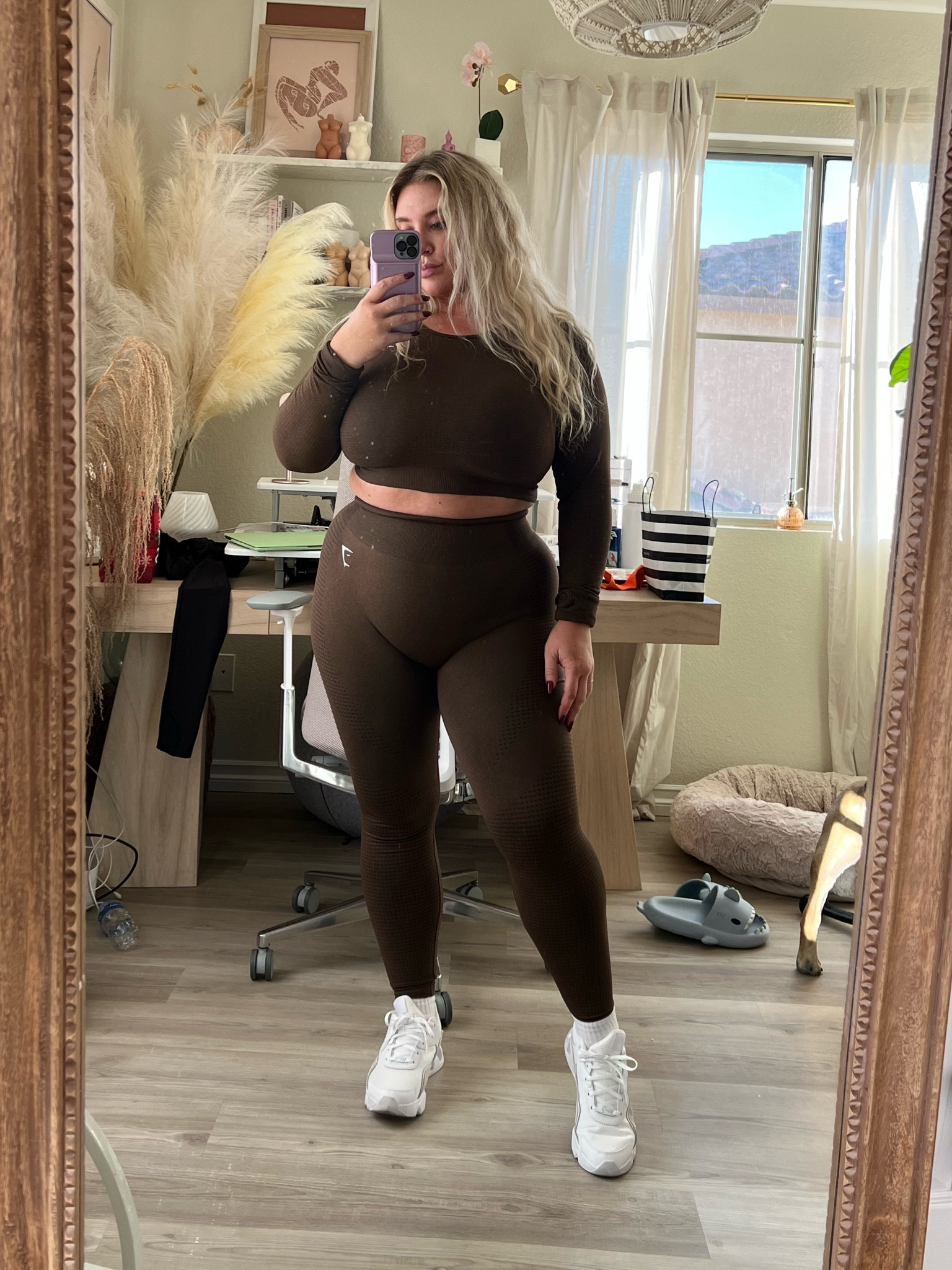 I love how this outfit’s rich, chocolate brown hue is both stylish and versatile, making it perfect for any casual setting. The fit is incredibly flattering, accentuating curves while the white sneakers add a fresh, sporty touch.