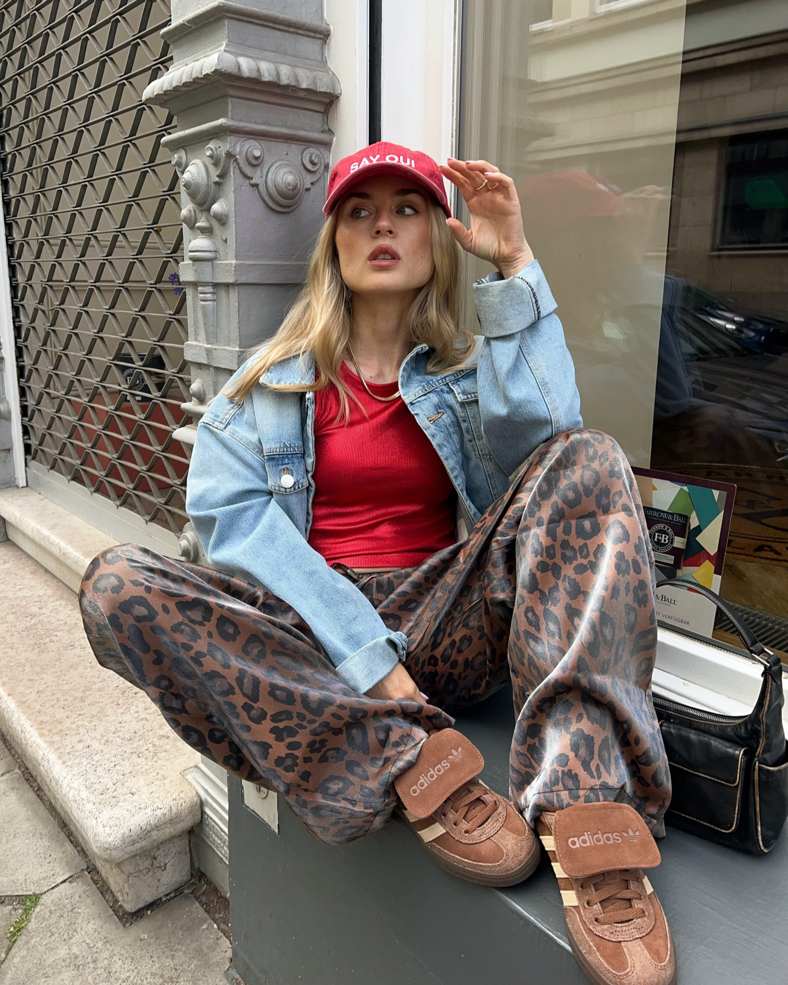 I love how this outfit combines bold patterns with casual pieces, like the leopard print pants and denim jacket, creating a chic yet relaxed look. The red cap and top add a vibrant pop of color that ties the entire ensemble together effortlessly.