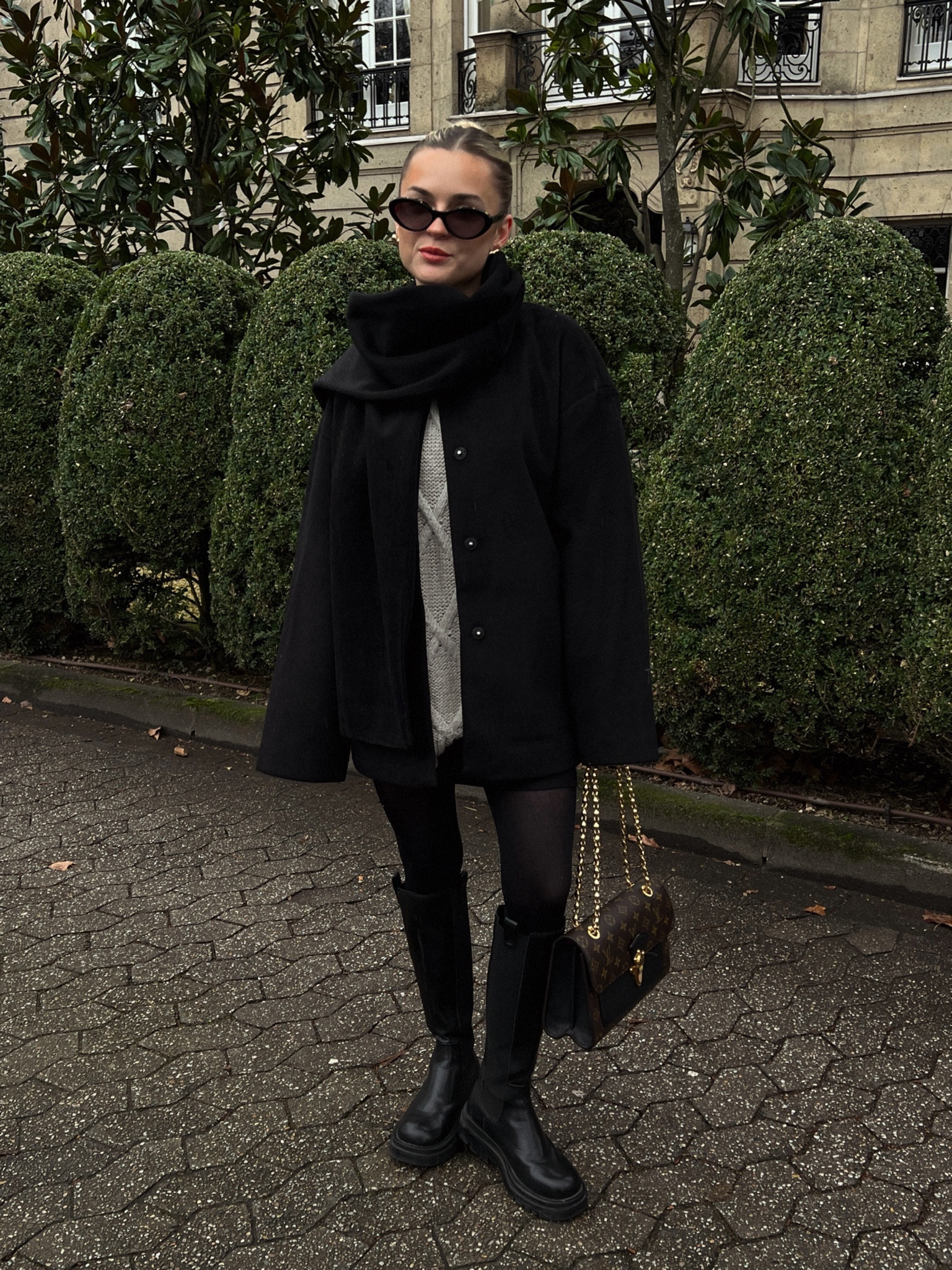 I love this outfit because it’s a perfect blend of elegance and comfort with its oversized coat and chic scarf. The boots and handbag add a touch of sophistication, making it ideal for a stylish winter day out.