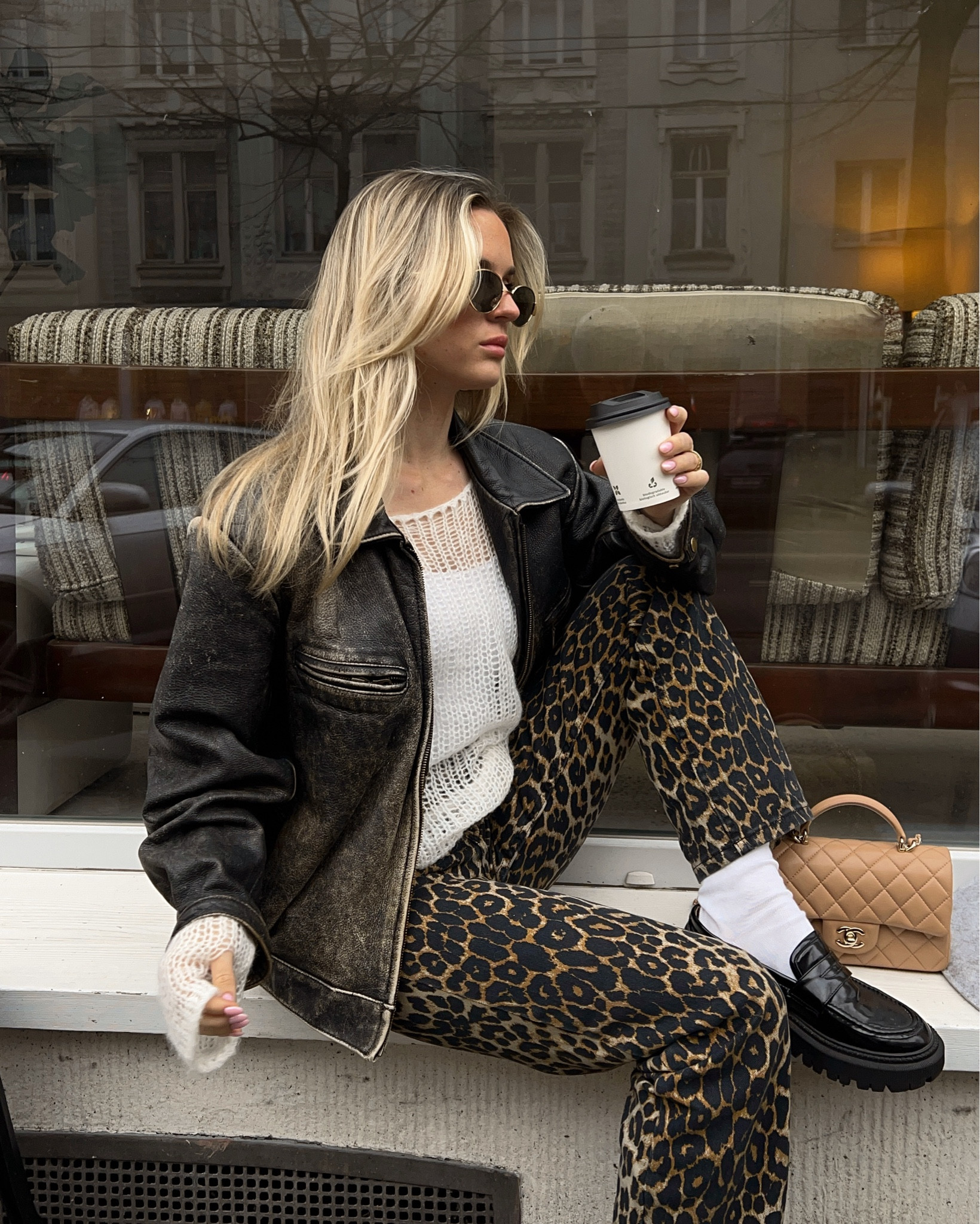 I love how the edgy, oversized leather jacket contrasts perfectly with the wild leopard print pants, creating a balanced yet striking look. The white knit adds a cozy touch while the chic quilted bag elevates the overall ensemble, combining comfort with high fashion effortlessly.