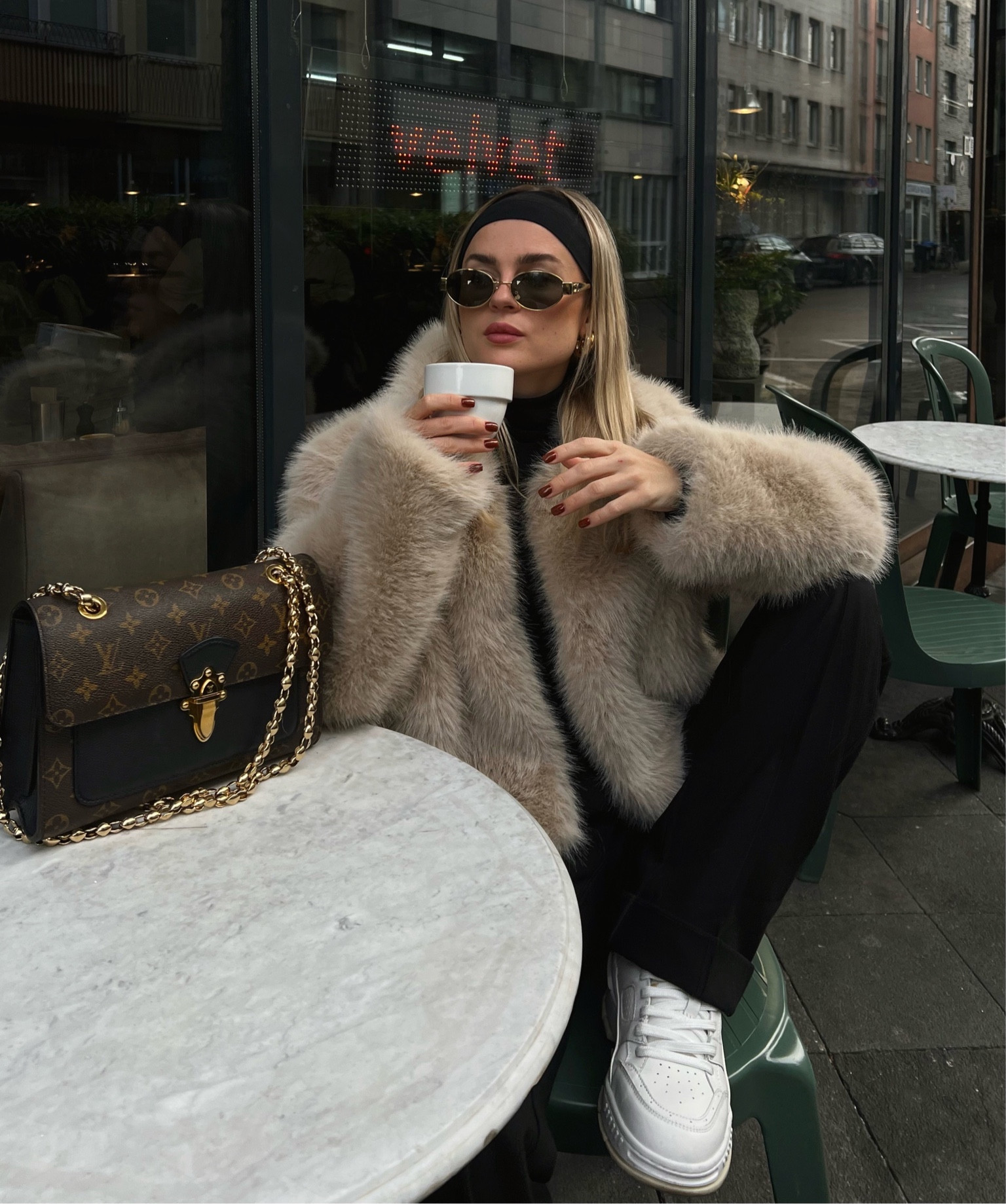 I love this outfit because the luxurious fur coat paired with chic sunglasses exudes sophistication, while the white sneakers add a casual, street-smart edge. The designer handbag adds a touch of elegance, making it perfect for both day and night outings.