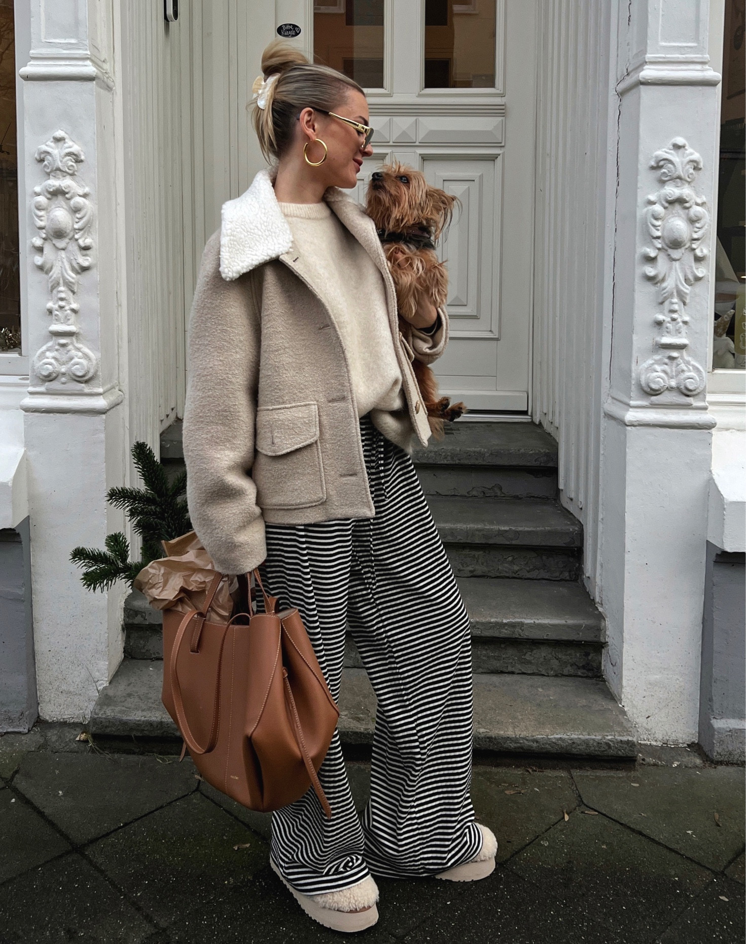 I love how this outfit perfectly blends cozy and chic elements, with the teddy coat and knit top providing warmth and comfort. The striped wide-leg pants and matching accessories add a stylish, modern touch, making it an effortlessly fashionable look.
