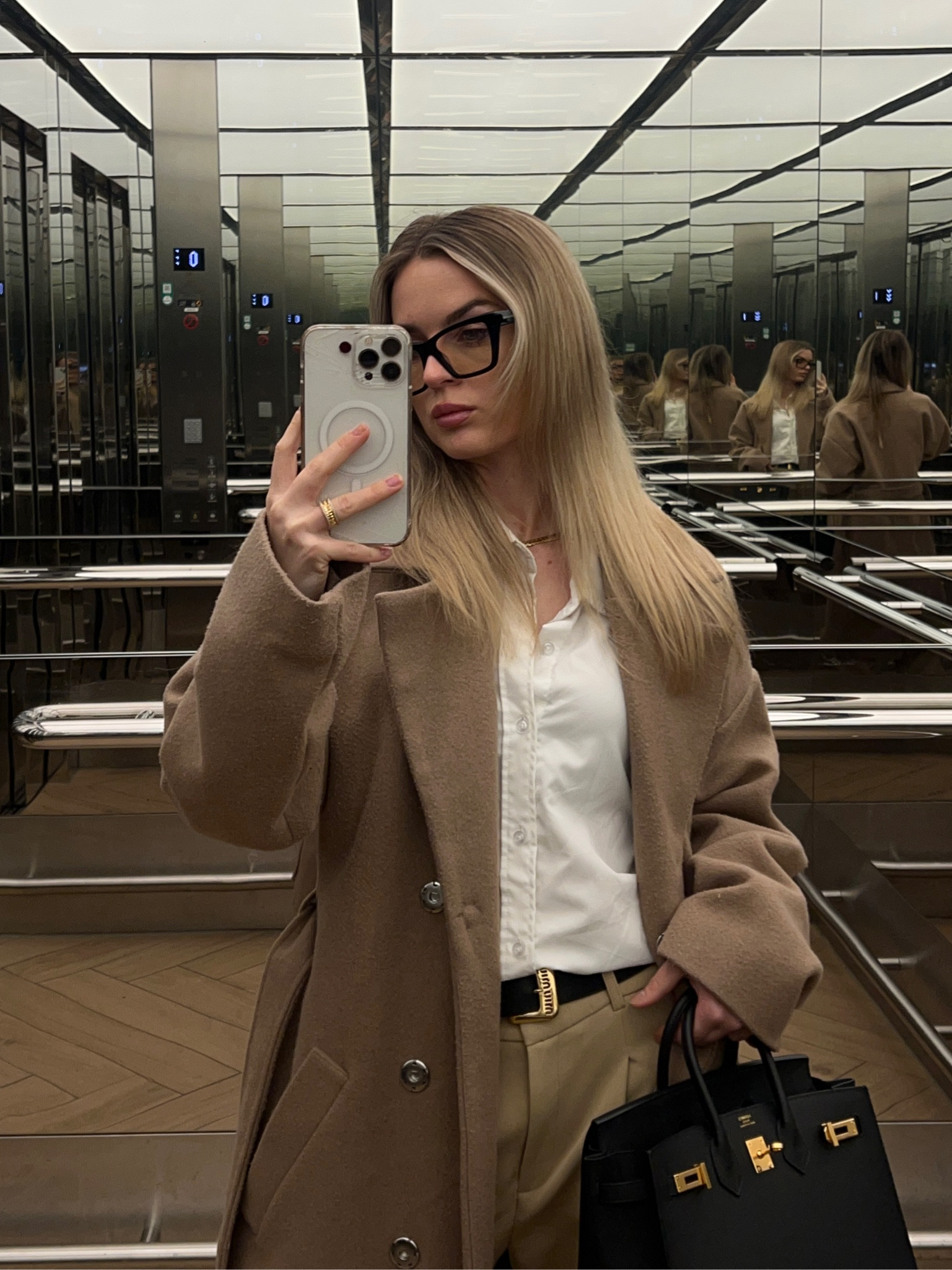 I love how the neutral tones of the coat and pants create a sophisticated and timeless look. The tailored fit and minimal accessories enhance the outfit’s chic and polished aesthetic.