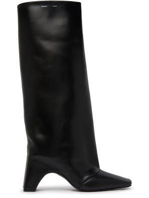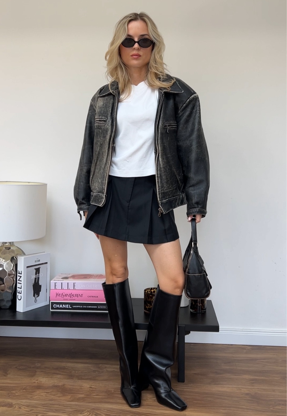 I love how the edgy oversized leather jacket pairs perfectly with the sleek knee-high boots, adding a bold contrast to the classic white tee and pleated mini skirt. The ensemble strikes a great balance between effortless chic and fashionable attitude.