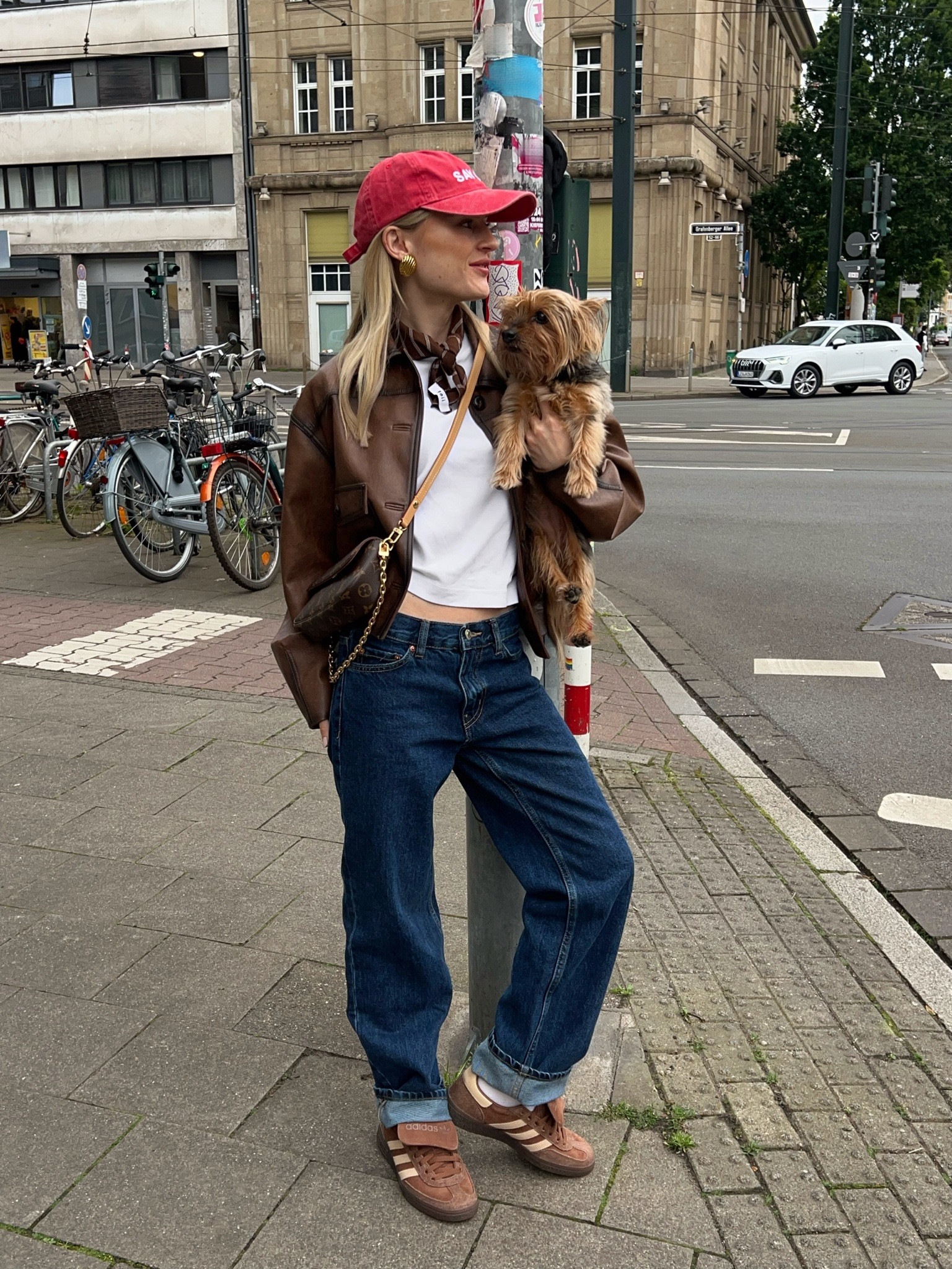 I love how the oversized leather jacket and loose jeans create a relaxed yet stylish look, while the red cap adds a pop of color and a playful touch. The outfit is effortlessly chic and perfect for a casual day out.