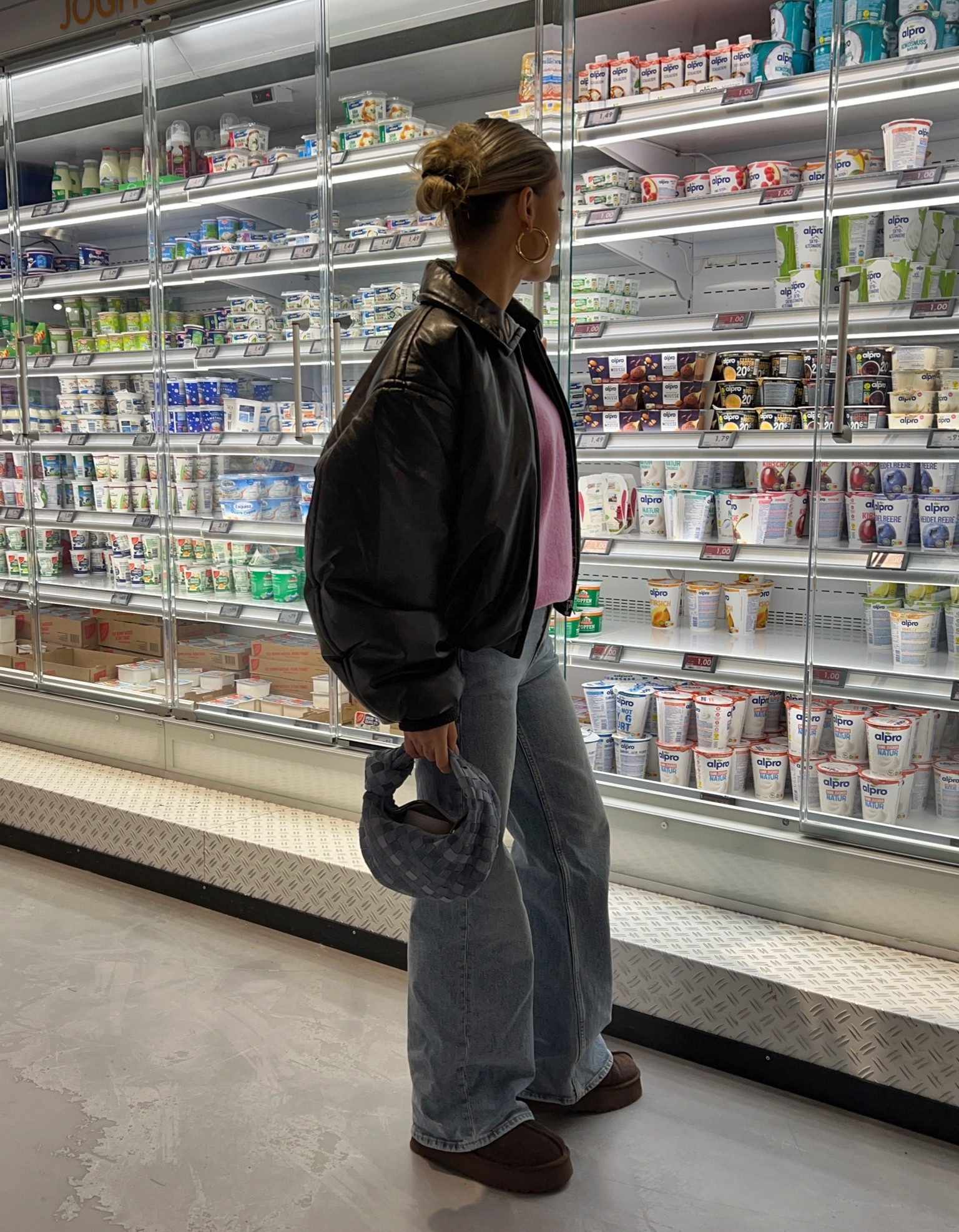 I love the blend of casual and chic elements with the oversized leather jacket adding an edgy vibe, while the wide-leg jeans and cozy sweater maintain a relaxed feel. The accessorizing with bold hoops and a plush handbag balance out the look perfectly.