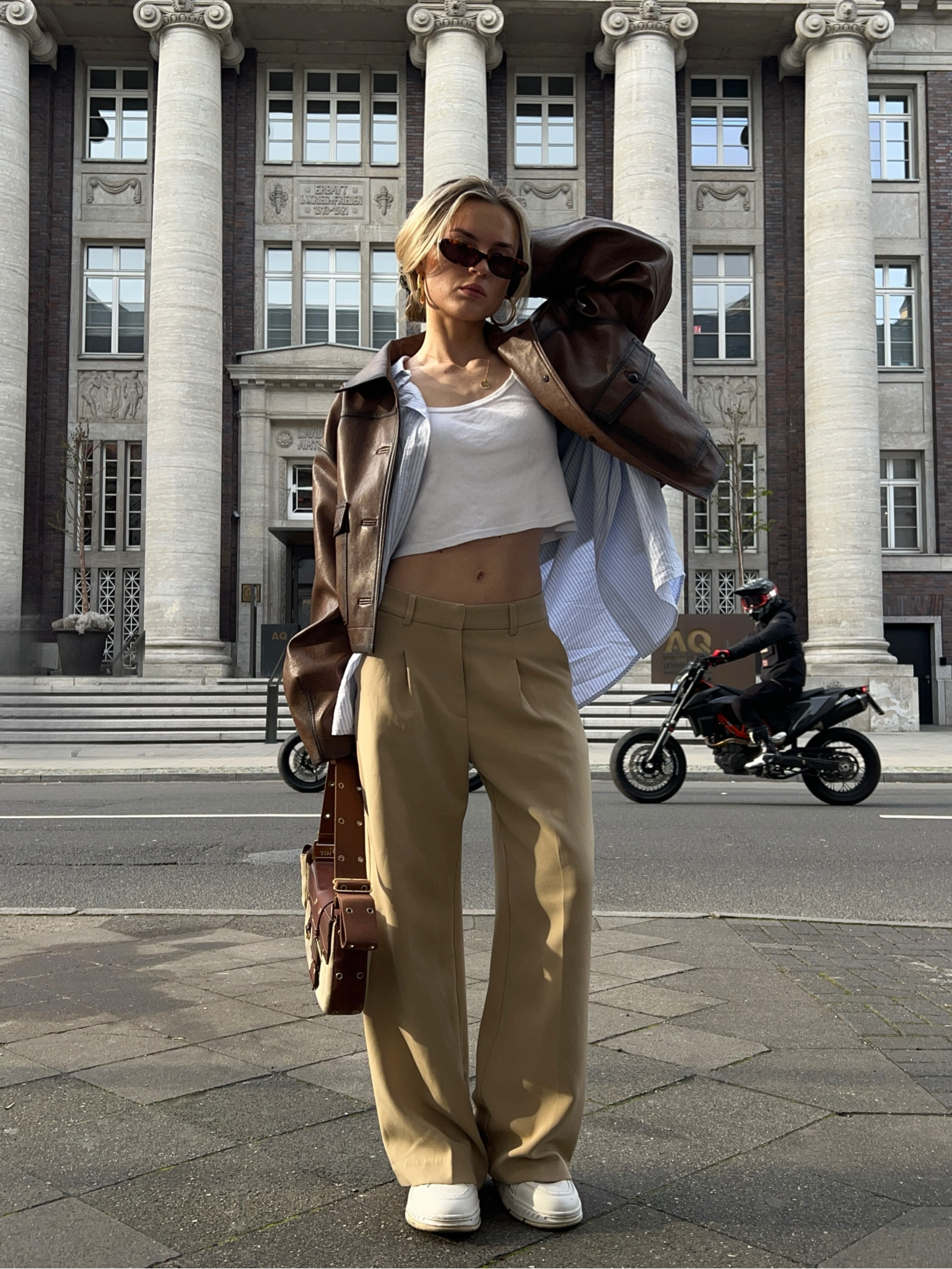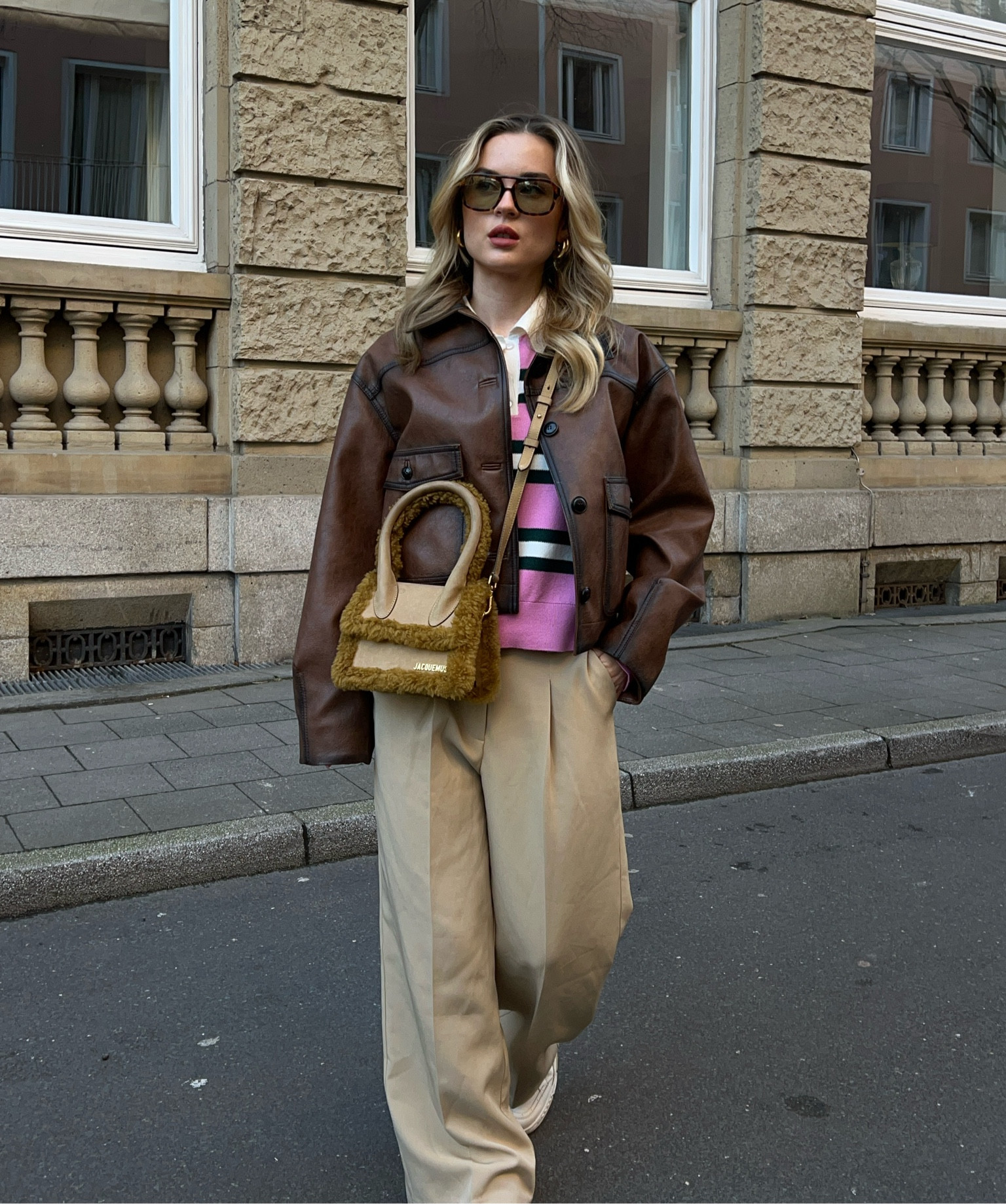 I love how the oversized brown leather jacket adds a bold, edgy flair while effortlessly balancing the casual denim overalls. The coordinated neutral accessories and the pop of color from the pink sneakers add personality and cohesion to the entire ensemble.