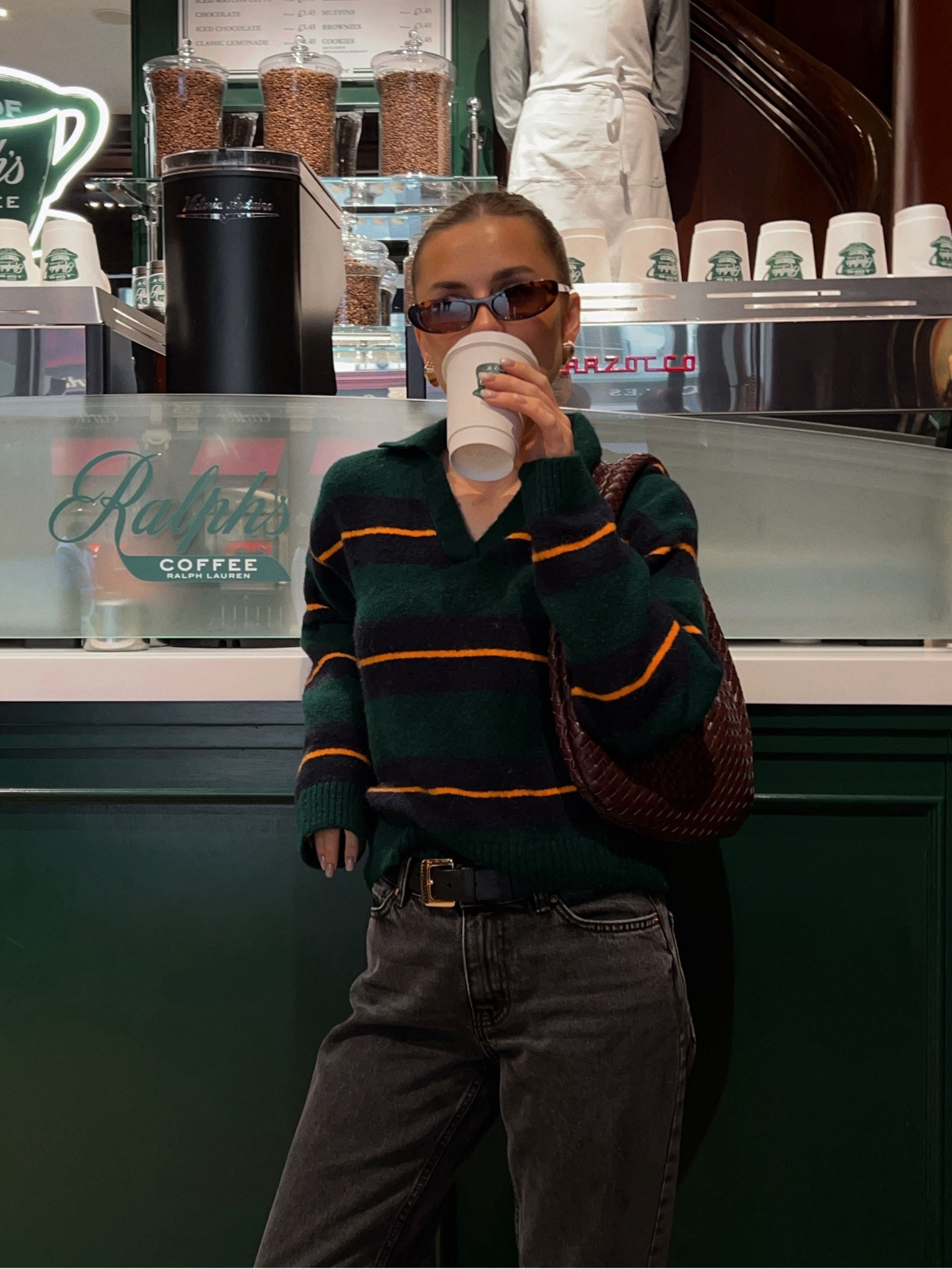 I love how the cozy, striped sweater adds a pop of color and personality to the classic, neutral-toned jeans. The chic sunglasses and woven bag elevate the casual look, making it effortlessly stylish.