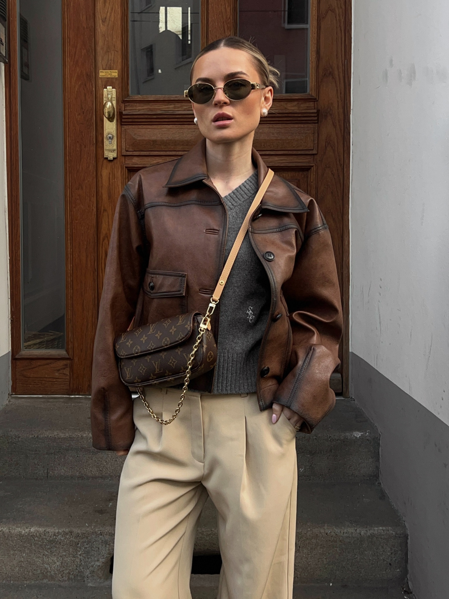 I love how this outfit combines a sleek leather jacket with a cozy grey sweater, creating a perfect blend of chic and casual. The cream trousers and stylish crossbody bag add a polished touch, making it effortlessly sophisticated.