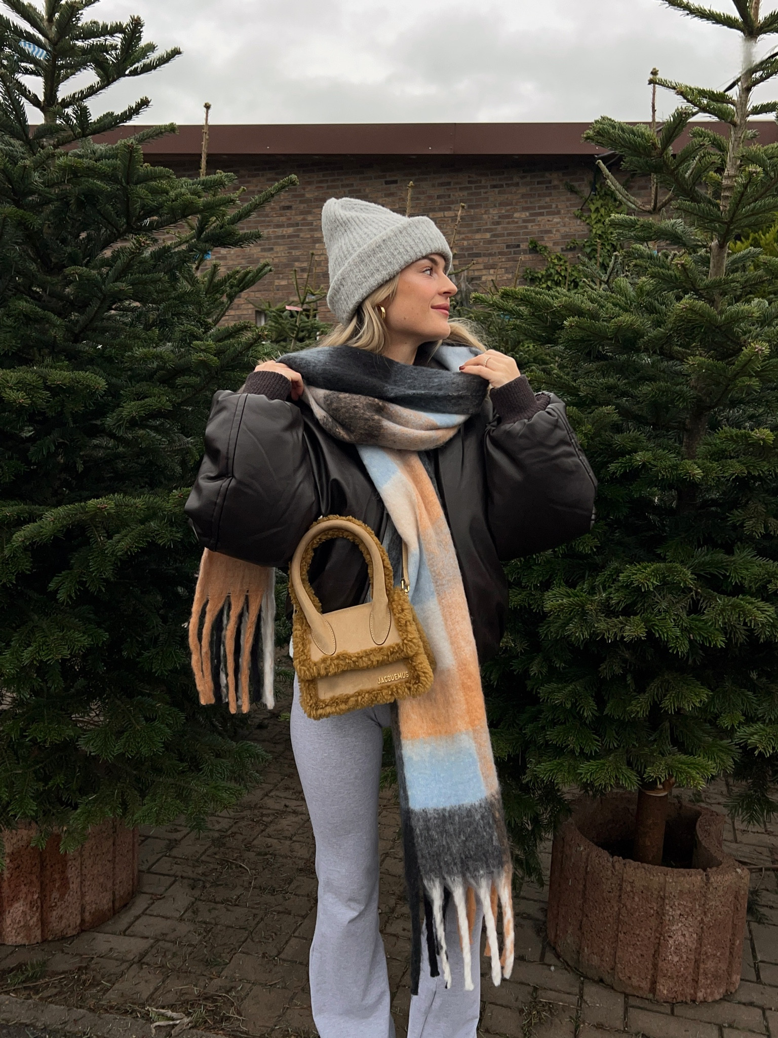 I love this outfit because the oversized jacket and relaxed jeans create a cozy, effortlessly chic look. The pastel beanie and scarf add a playful touch, perfect for staying stylish in colder weather.