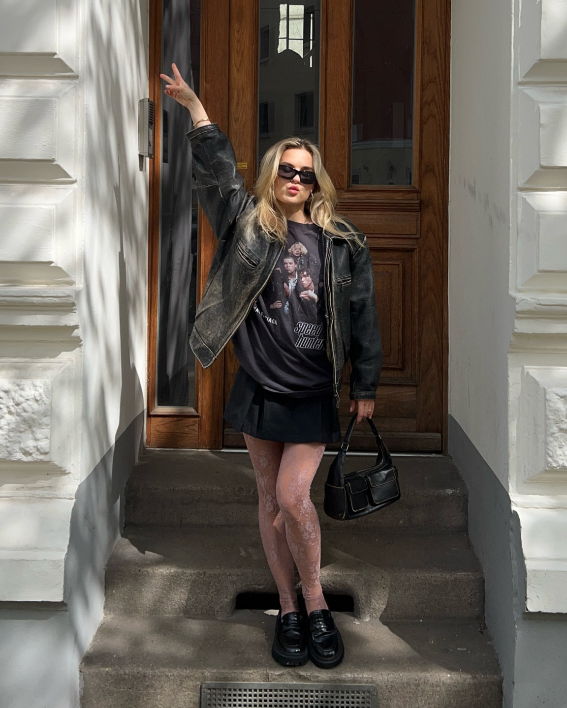 I love this outfit because it combines edgy elements like the oversized jacket and graphic tee with feminine lace tights and a chic handbag, creating a balanced and trendy look. The loafers add a touch of sophistication, making it perfect for urban street style.