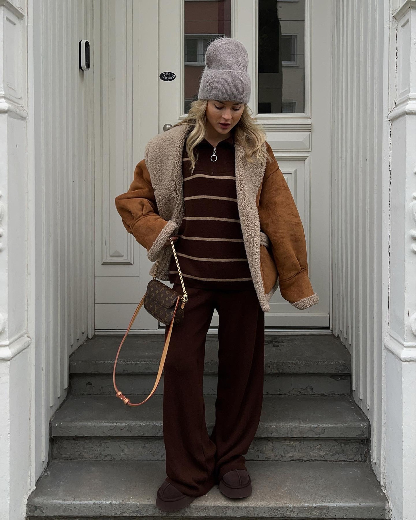 I love how the cozy shearling jacket effortlessly elevates the casual vibe, while the neutral tones create a harmonious and stylish look. The beanie and matching comfy pants add a perfect blend of warmth and chicness, making it ideal for a laid-back winter day.