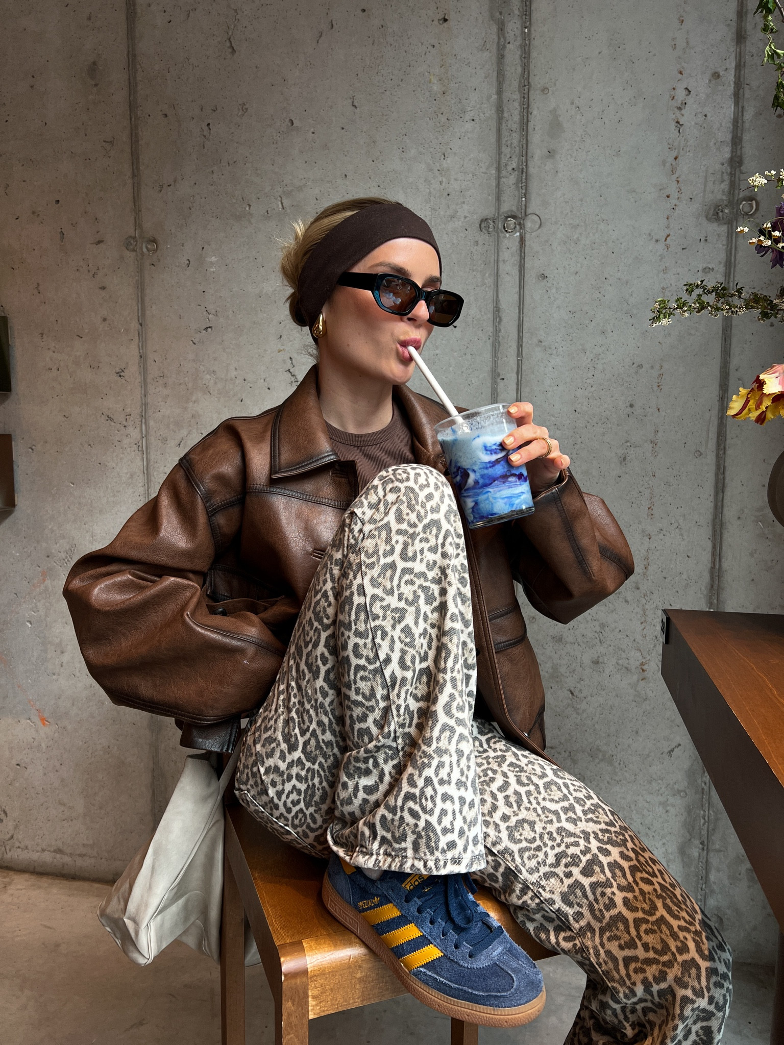 I love this outfit because the oversized leather jacket adds a chic edge, while the leopard print pants bring a fun, bold statement. The mix of textures and patterns creates a stylish, effortlessly cool look.