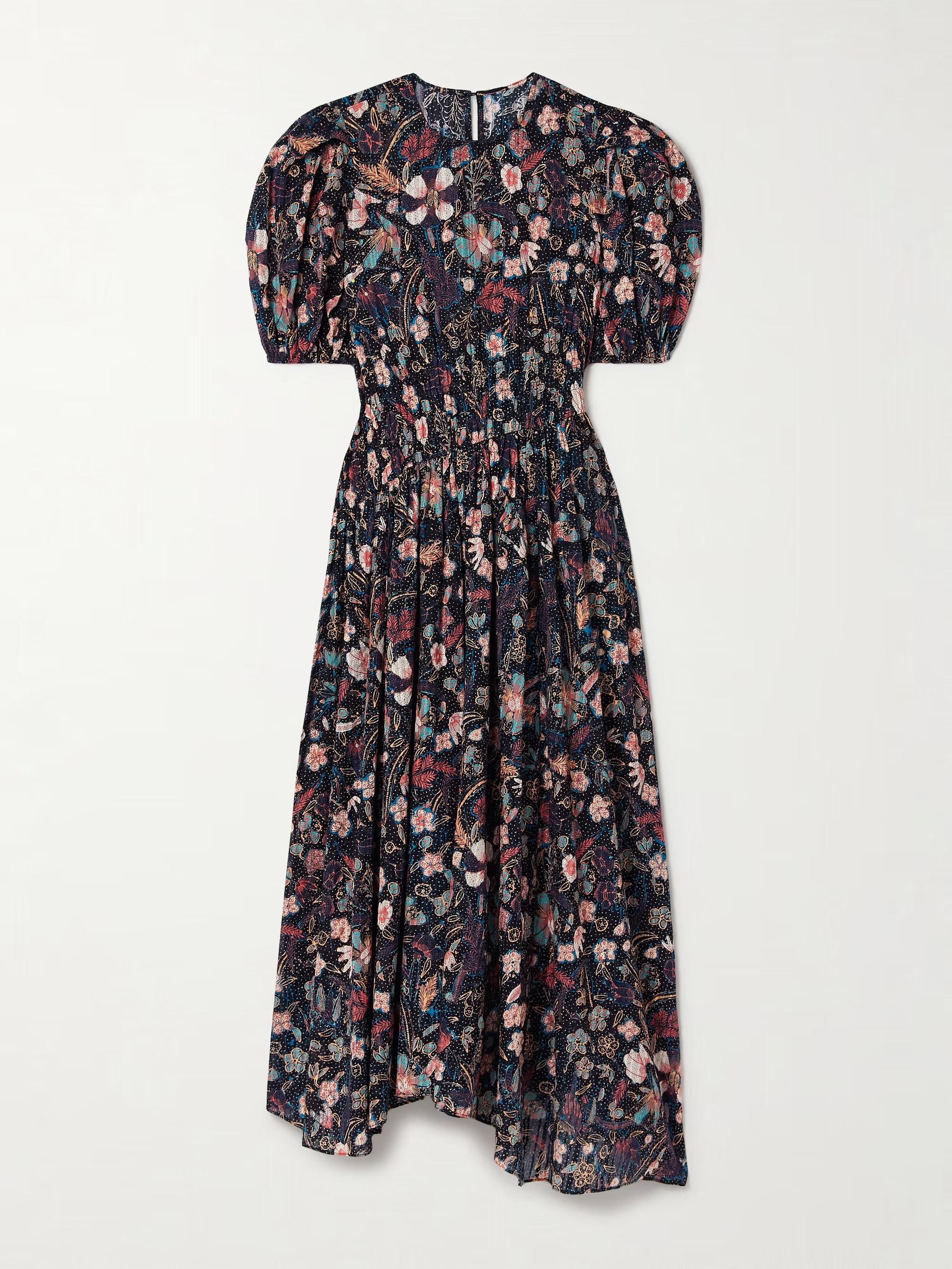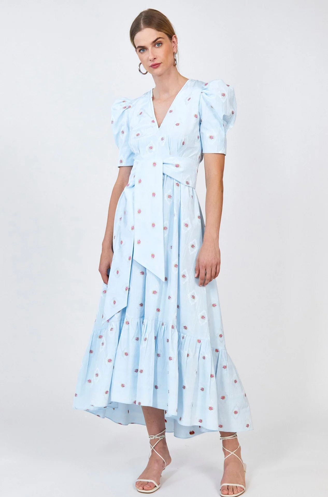 I love how the dress combines a vibrant floral print with elegant puff sleeves, effortlessly blending a vintage charm with modern sophistication. The subtle accessories and natural makeup perfectly enhance the outfit’s fresh, summery vibe.