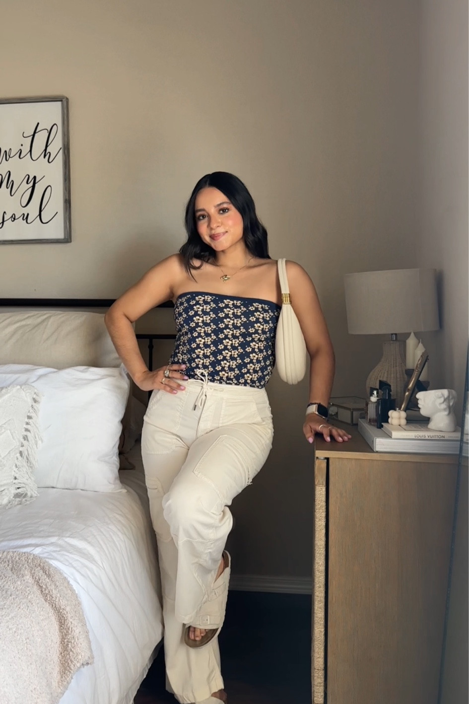 I love how this outfit balances a chic floral top with versatile high-waisted, wide-leg pants, creating a stylish yet comfortable look. The neutral accessories add a polished finish, perfect for any casual outing.
