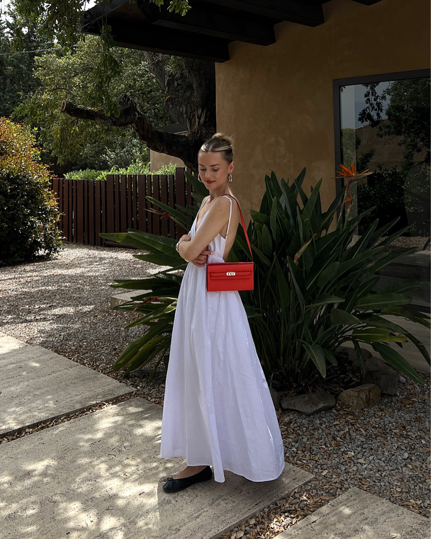 I love how the white dress effortlessly exudes grace and simplicity, while the pop of red from the handbag injects a vibrant, chic touch. The minimalistic accessories and black flats perfectly complement the ensemble, creating a balanced, sophisticated look.