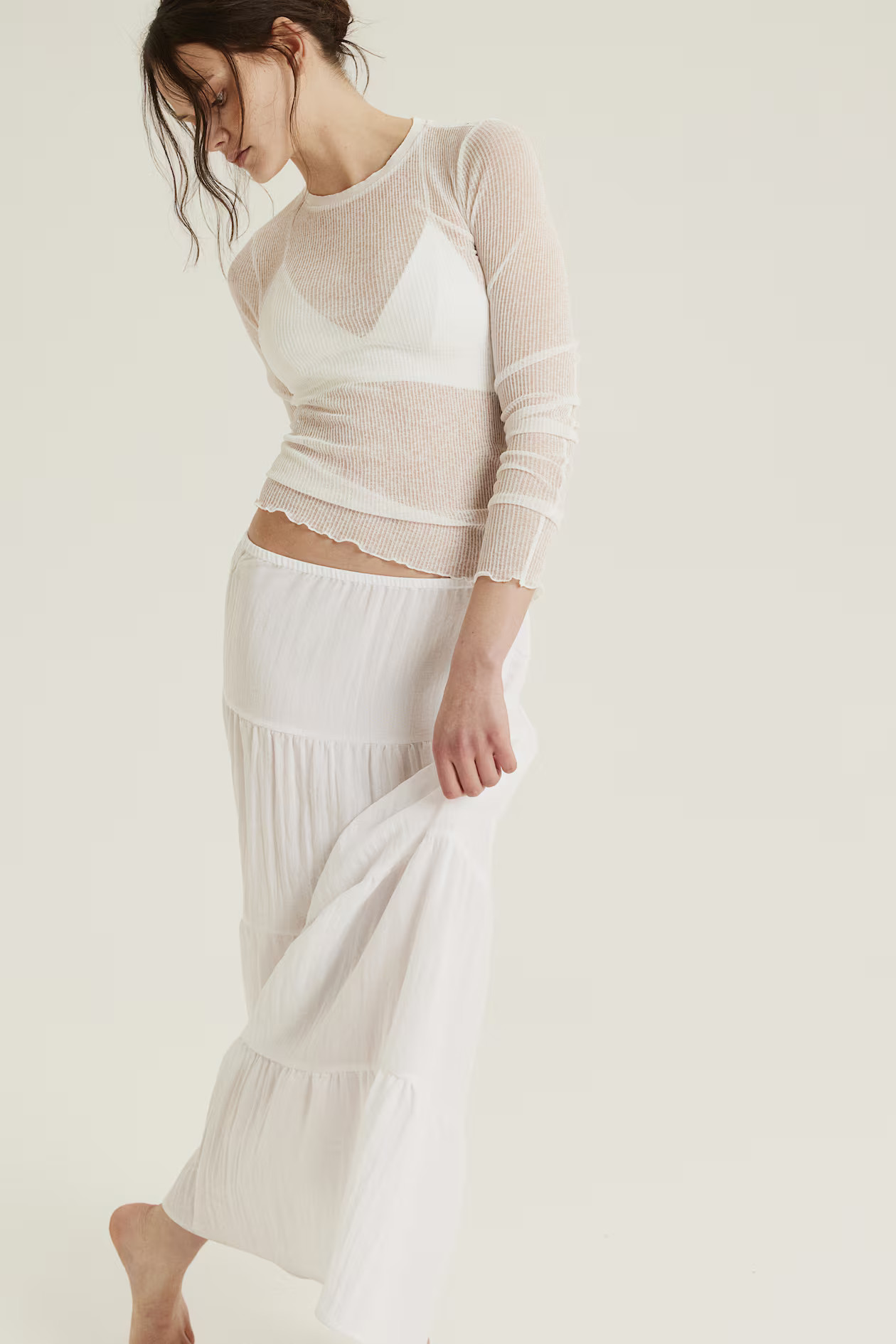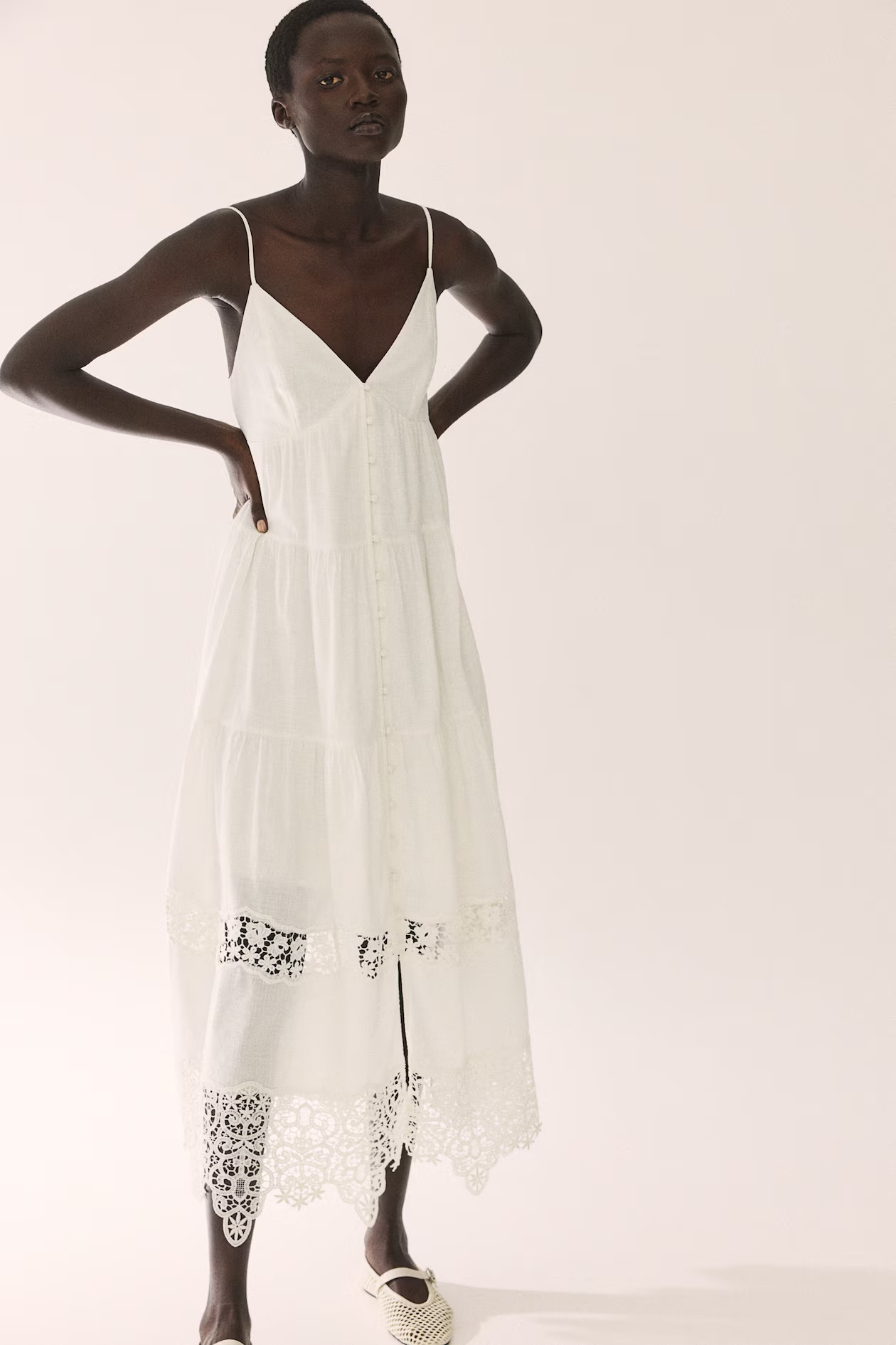 I adore this outfit’s effortless elegance; the light, flowing fabric and simple silhouette create a chic, relaxed look. The soft, neutral color complements the natural setting and enhances the overall vibe of understated sophistication.