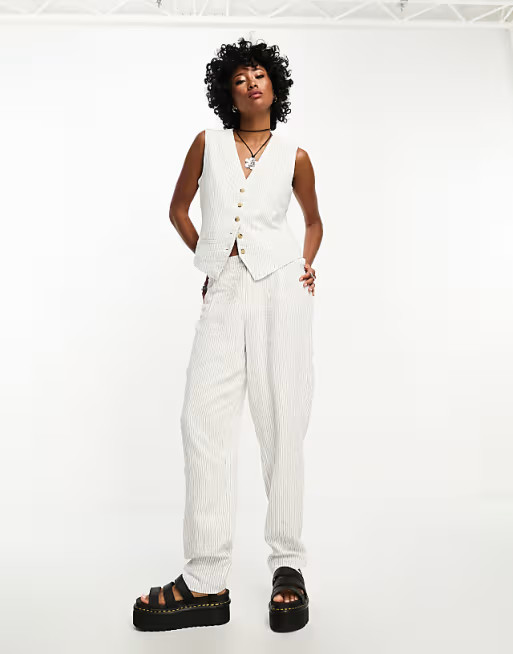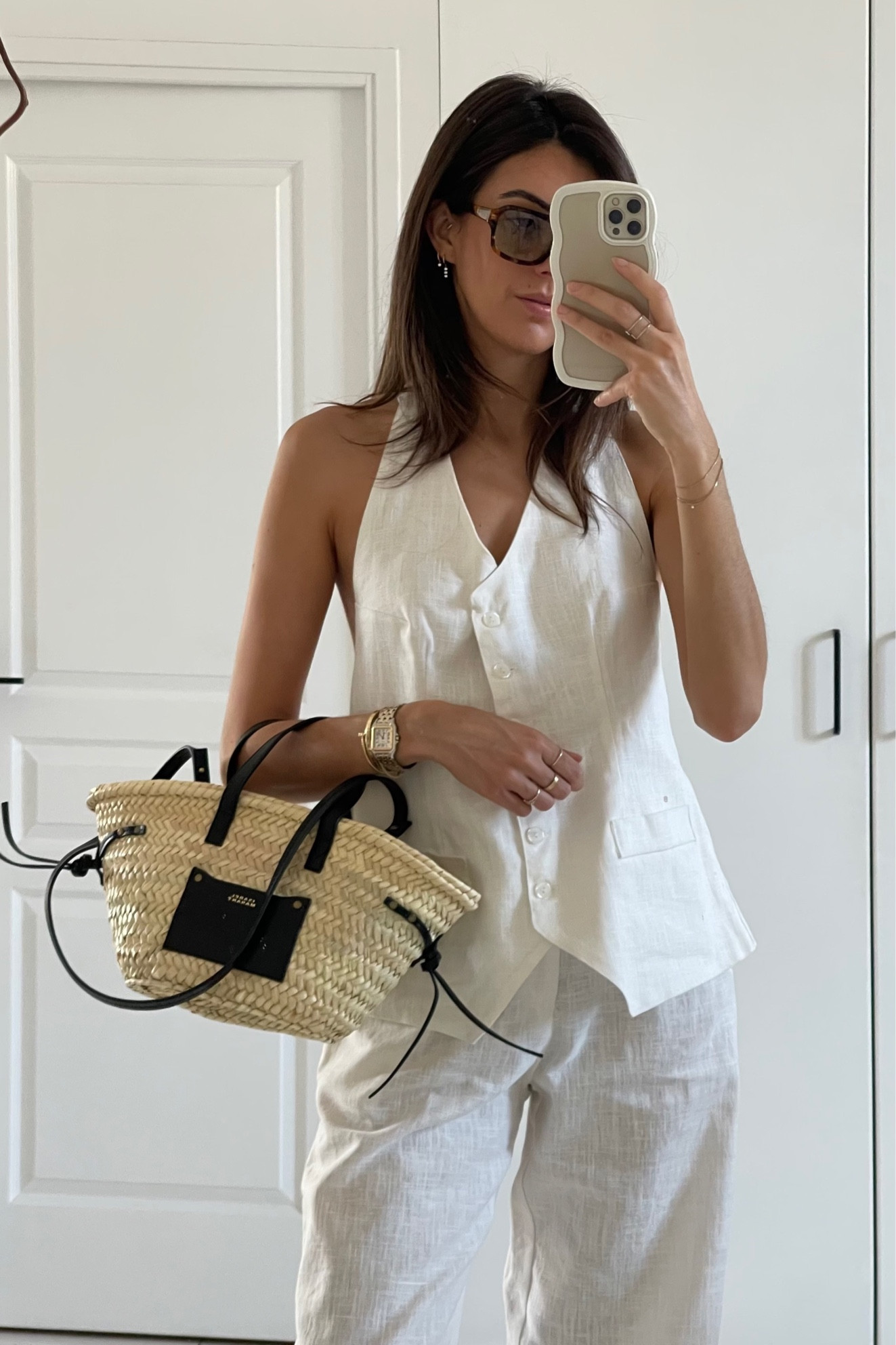 I love this outfit because the all-white linen ensemble exudes sophisticated simplicity, and the straw handbag adds a chic, summer-ready touch. The outfit is effortlessly stylish, perfect for both casual outings and upscale events.