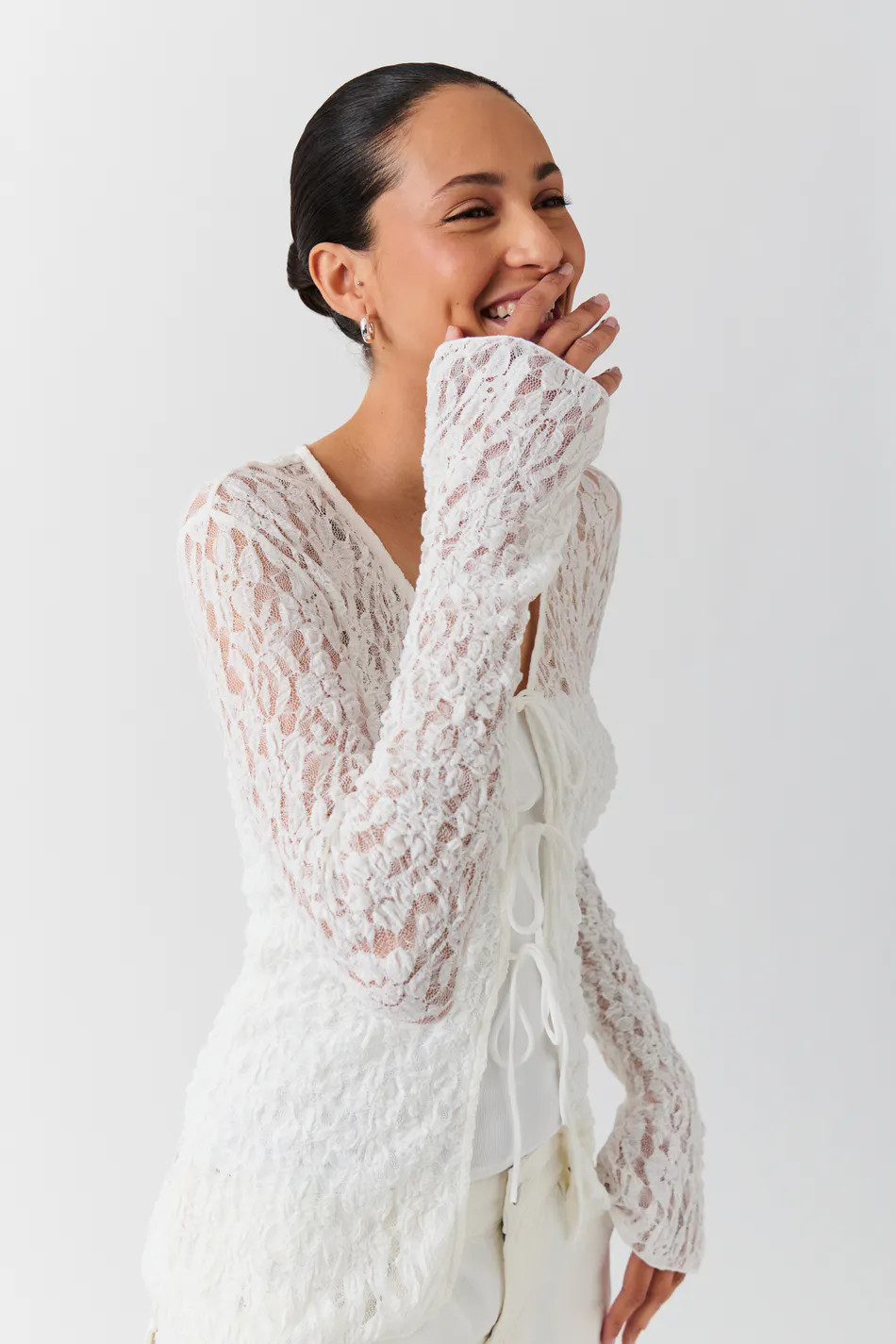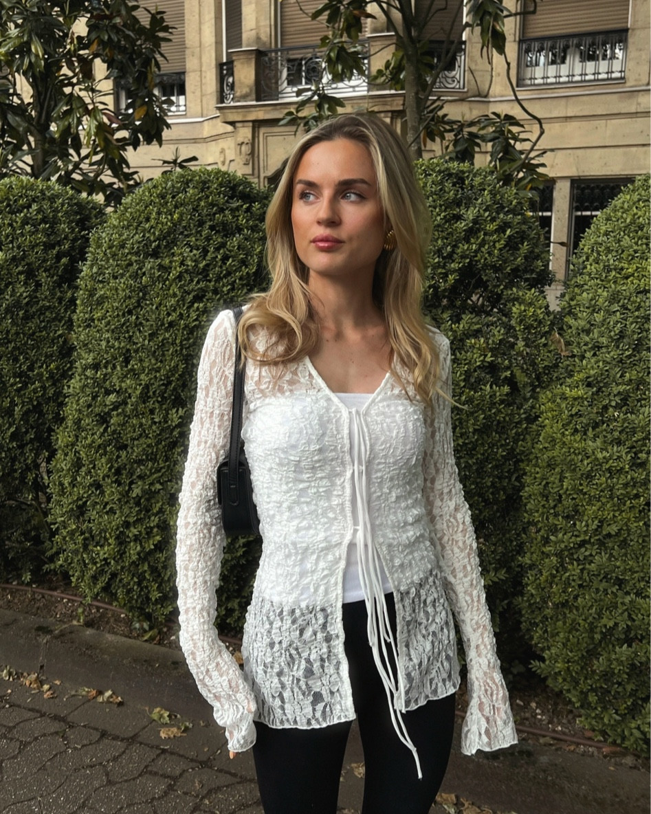 I love how the intricate lace detailing on the blouse adds elegance and texture, perfectly balancing the simplicity of the black pants. The overall look is sophisticated yet effortlessly chic, making it ideal for both casual and semi-formal occasions.