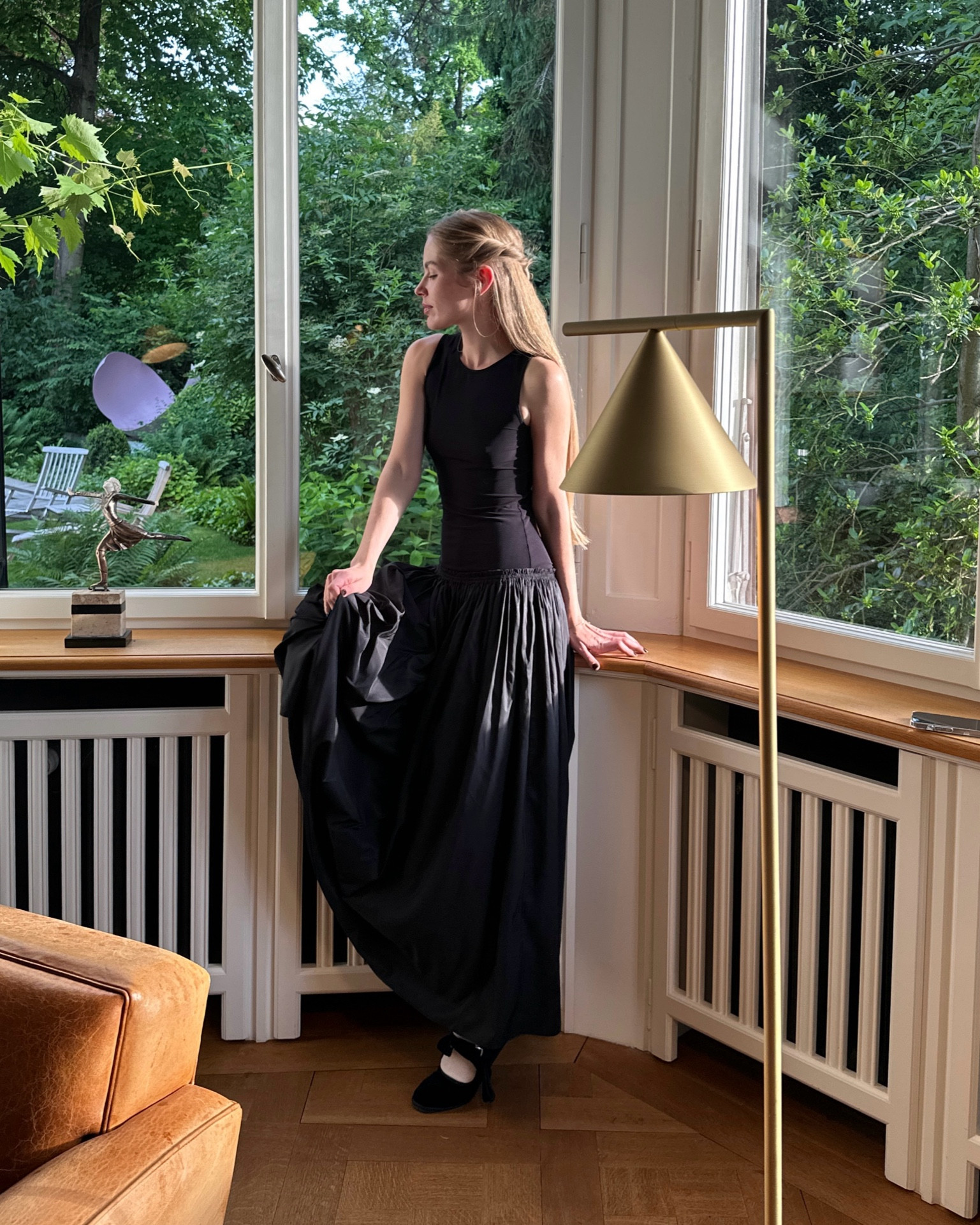 I love the elegant simplicity of the all-black ensemble, which creates a timeless and sophisticated look. The flowing skirt adds a touch of drama, while the fitted top balances the outfit beautifully.