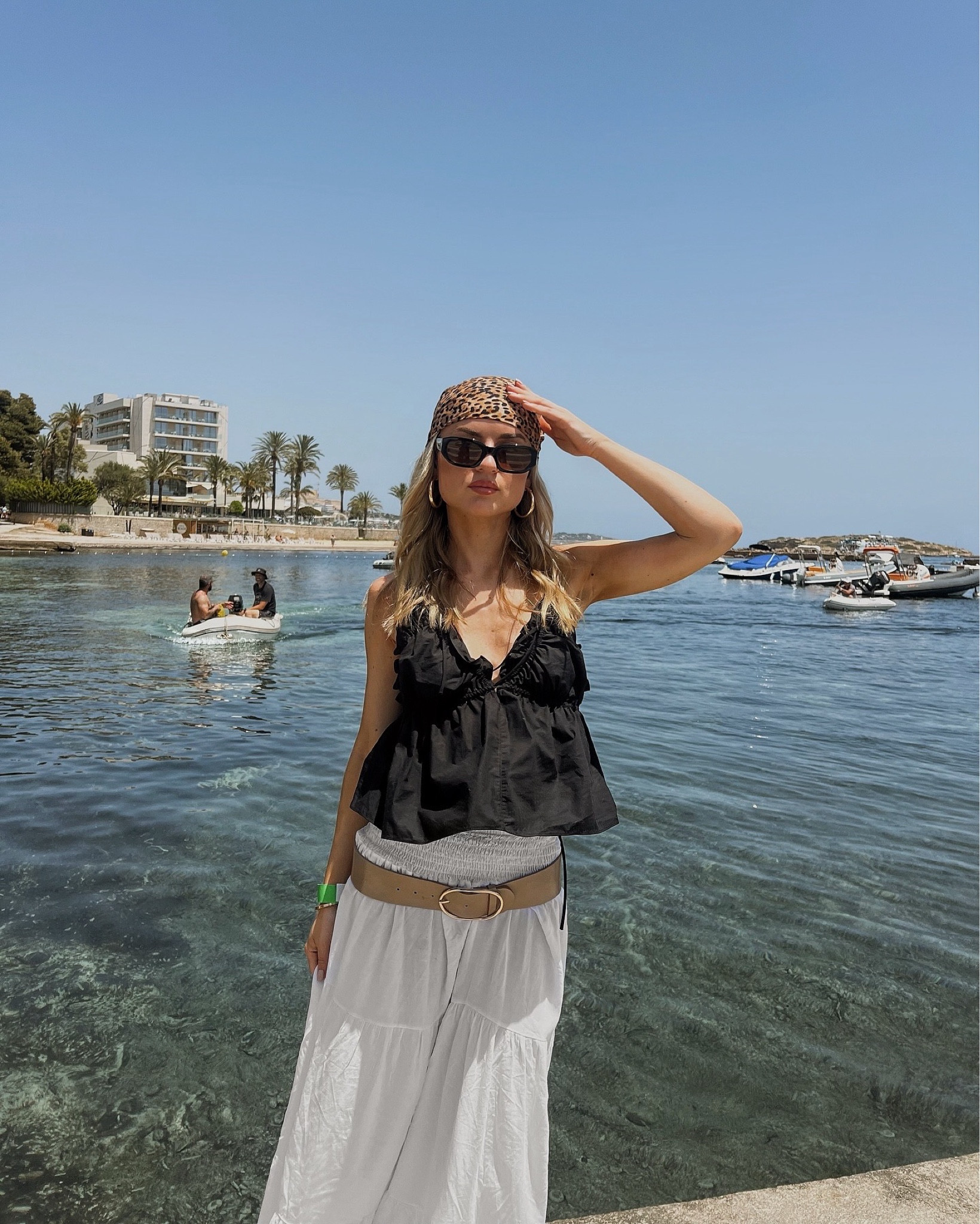 I love this outfit because the loose black top is both chic and comfortable, pairing perfectly with the airy white skirt for a relaxed, beachy vibe. The headscarf and sunglasses add a stylish flair that completes the seaside look effortlessly.