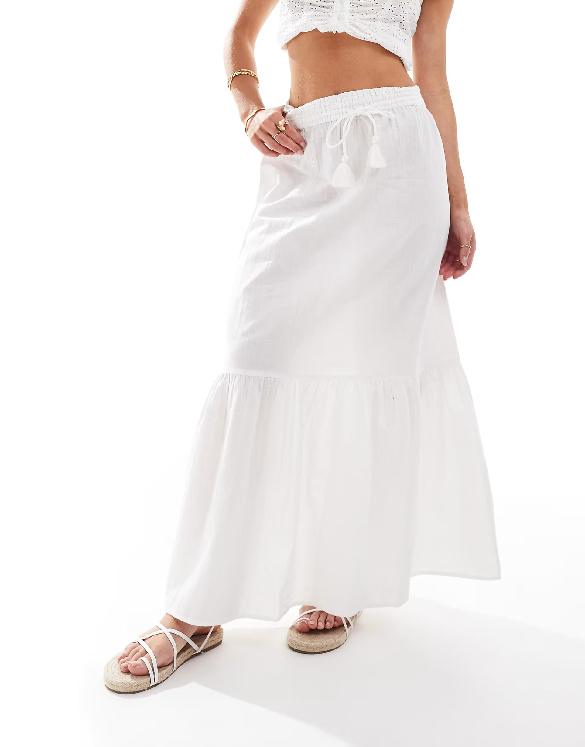 I love how the off-shoulder top highlights the collarbones while the layered white skirt adds a playful and airy vibe. The headscarf injects a pop of color, creating a balanced, boho-chic look that’s perfect for summer.