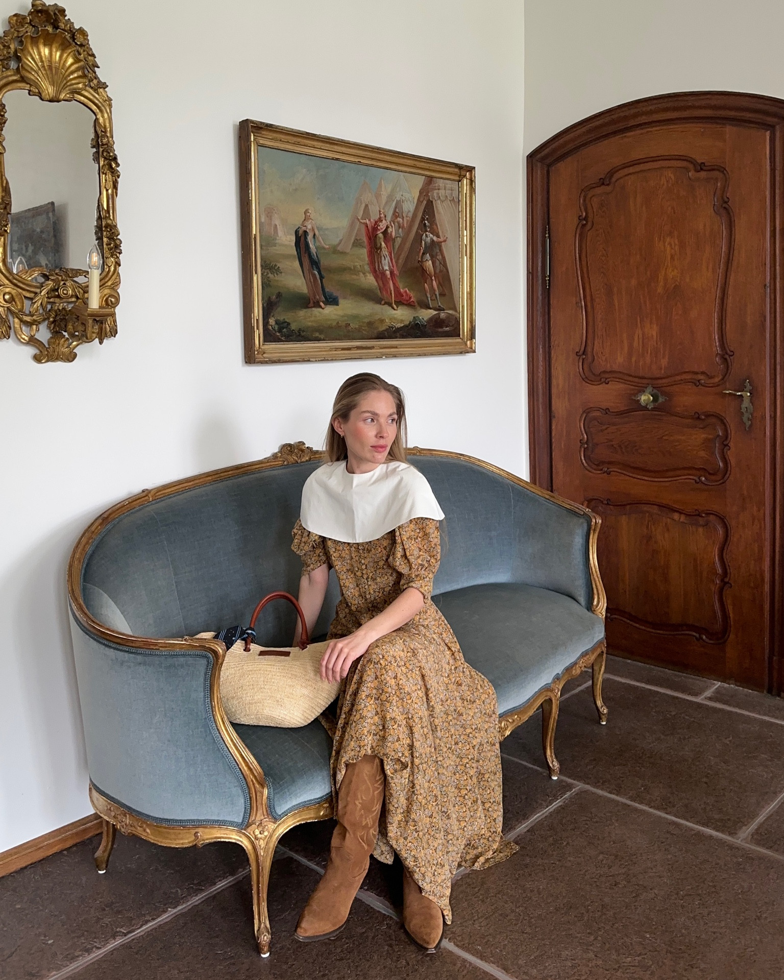 I love the vintage charm of this floral dress paired with the modern, oversized collar; it elegantly blends classic and contemporary styles. The suede boots and woven bag add earthy textures, perfectly complementing the outfit’s relaxed yet sophisticated vibe.