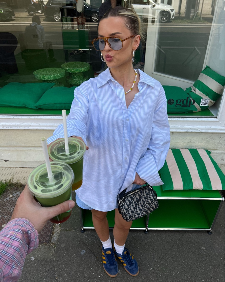 I adore this outfit because the oversized shirt dress gives a chic, effortlessly stylish look, and the accessories, like the designer bag and sleek sunglasses, add a touch of sophistication. The casual sneakers and socks give it a trendy, laid-back vibe.